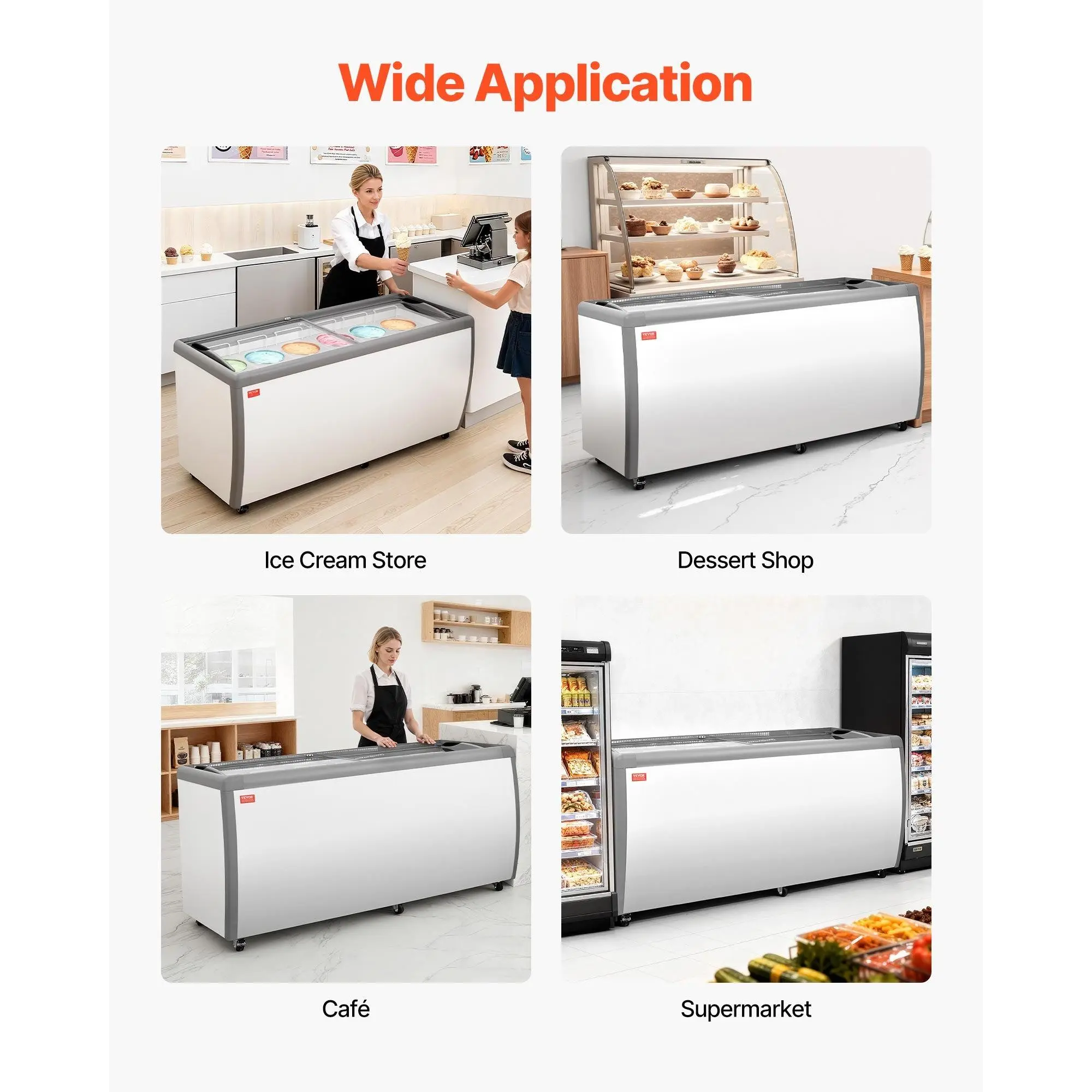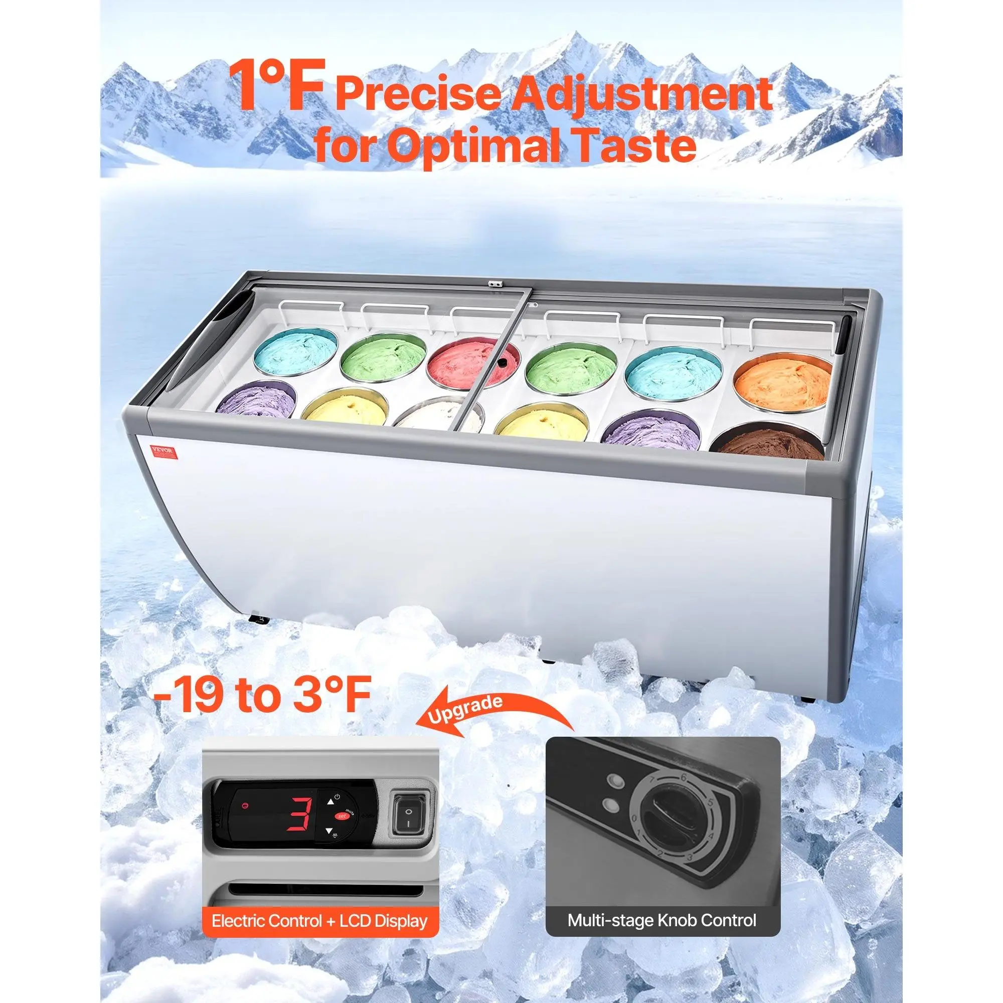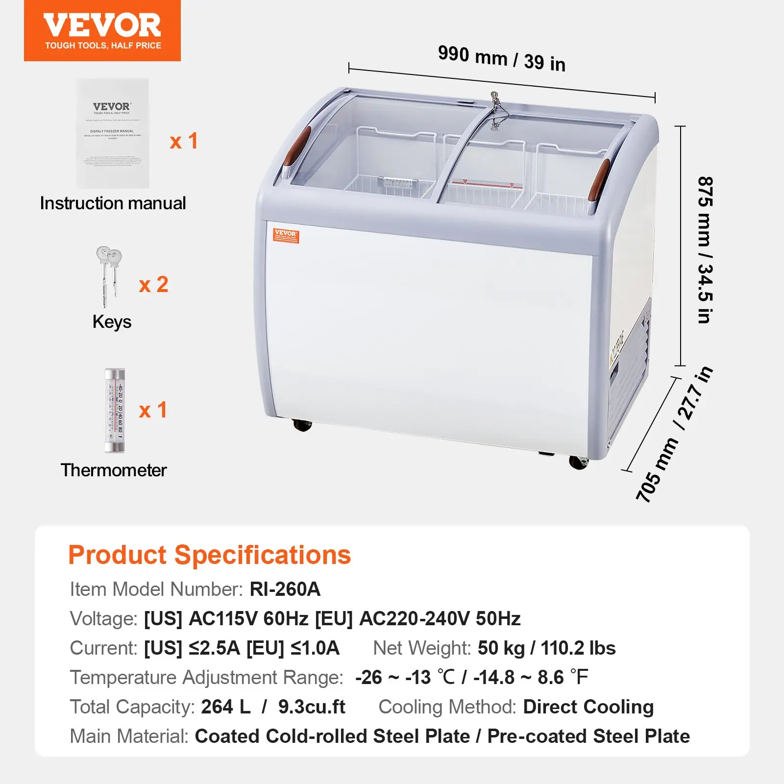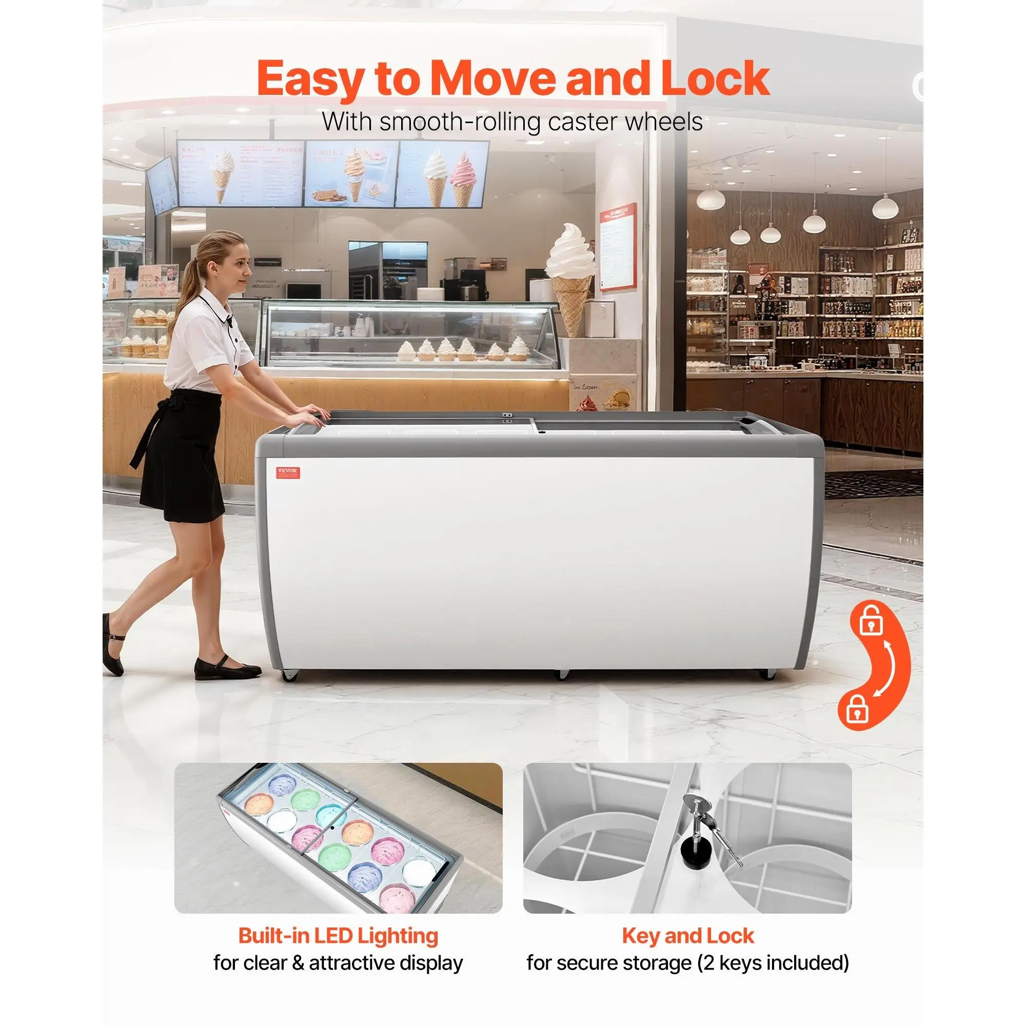VEVOR Commercial Ice Cream Display Case, 20 Cu. ft Chest Freezer, Restaurant Gelato Dipping Cabinet Top Deep Freezer with Locking Casters, Sliding Glass Door, LED Lighting, Hold 12 Ice Cream TubsLockable WheelsKey and LockDrainage OutletThoughtful DesignWide ApplicationDrainage Outlet for Easy CleaningCapacity: 20 cu. ft/ 567 L, Cooling Method: Direct Cooling, Item Model Number: RI-560DC, Temperature Range: -19 to 3/-28 to -16 C, Current: 4.0A, Net Weight: 196.21 lbs/ 89 kg, Power: 295W, Main Material: Coated cold-rolled steel plate+ Pre-coated steel plate