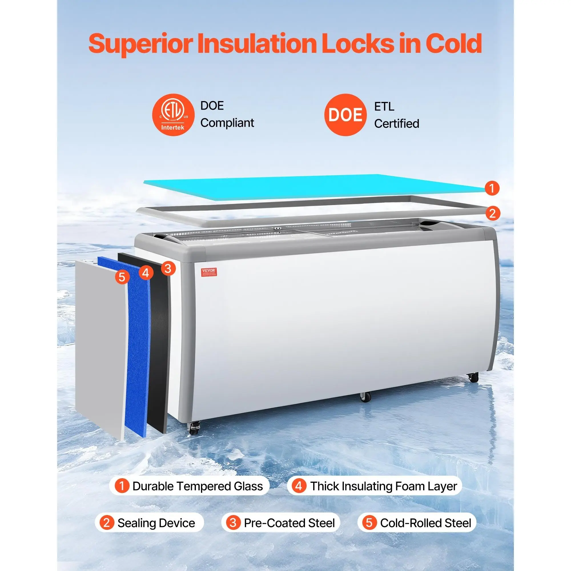 5. VEVOR Commercial Ice Cream Display Case, 20 Cu. ft Chest Freezer, Restaurant Gelato Dipping Cabinet Top Deep Freezer with Locking Casters, Sliding Glass Door, LED Lighting, Hold 12 Ice Cream Tubs