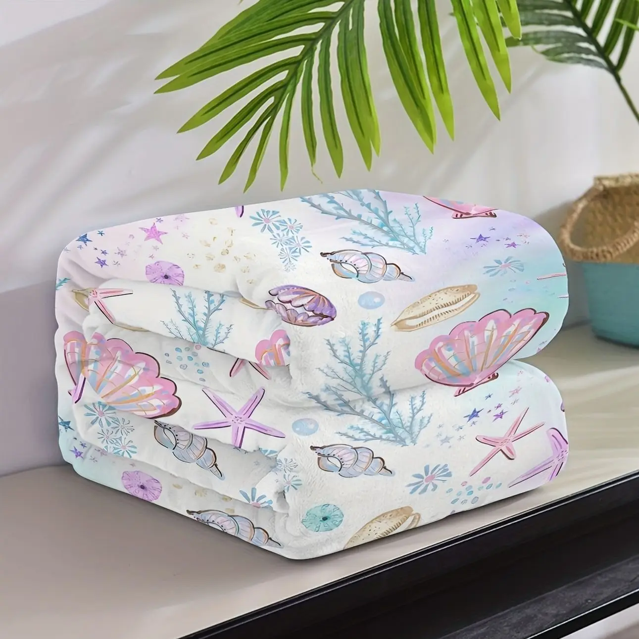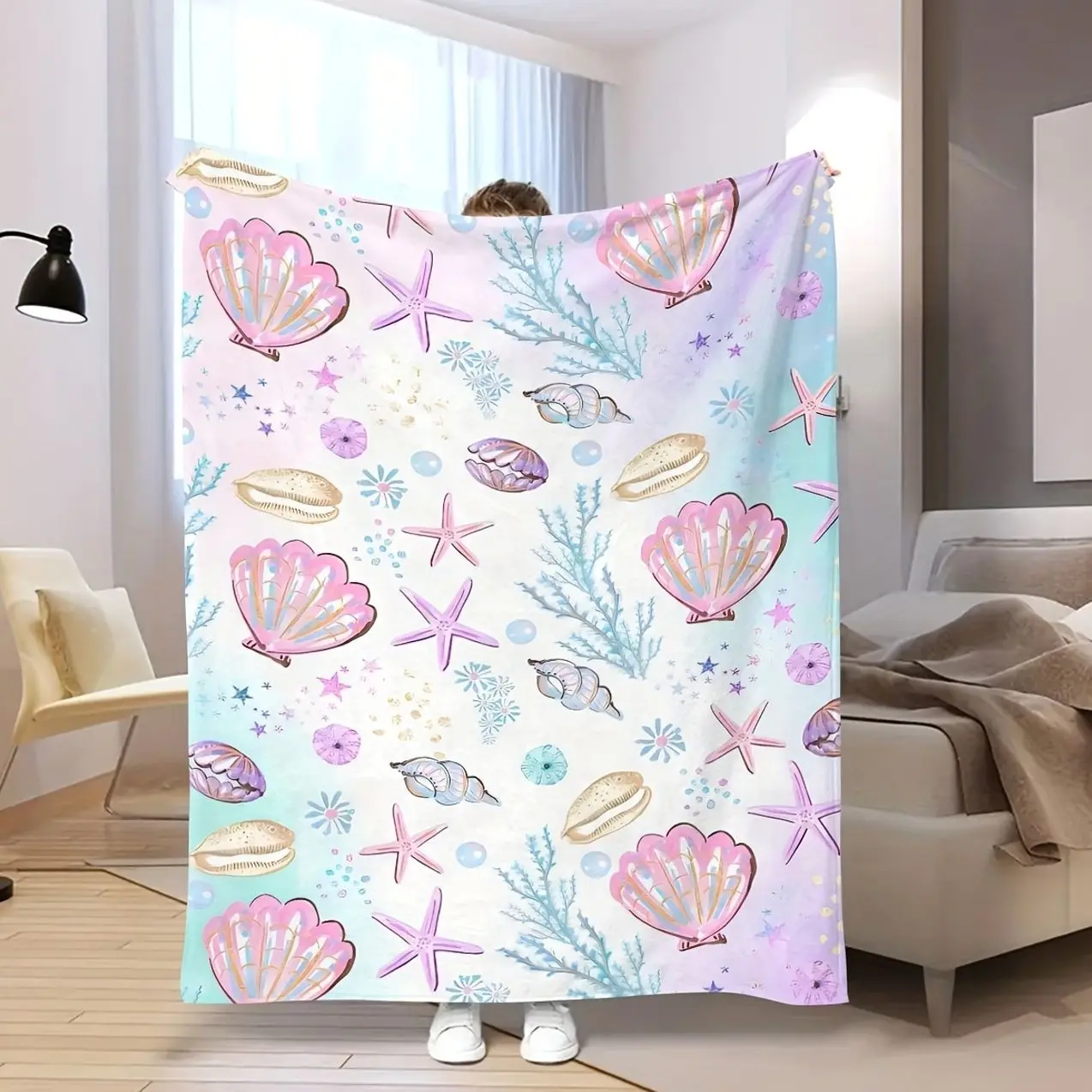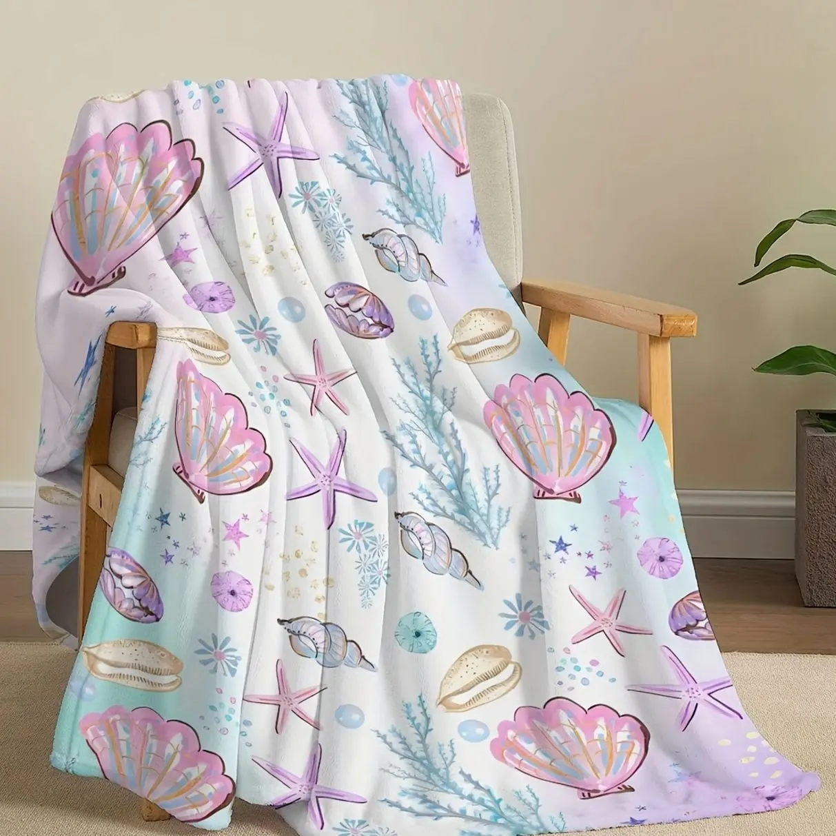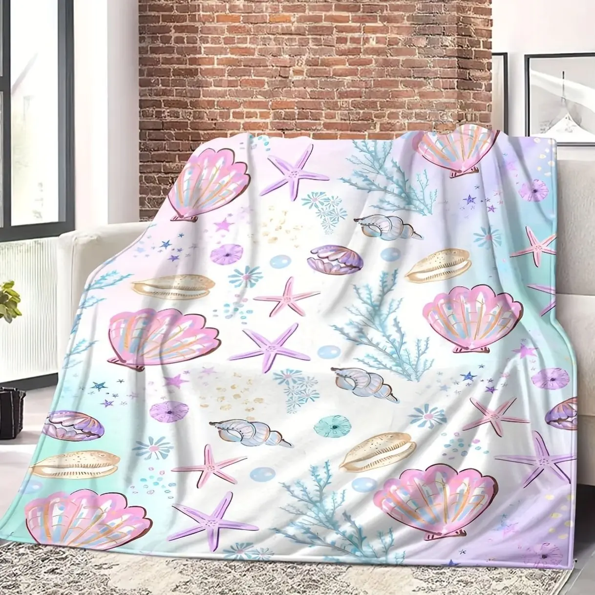 Luxurious All-Season Flannel Throw Blanket with Vibrant Underwater Elements - Cozy, Machine Washable, Multipurpose Fleece in Mixed Colors with Seashells E