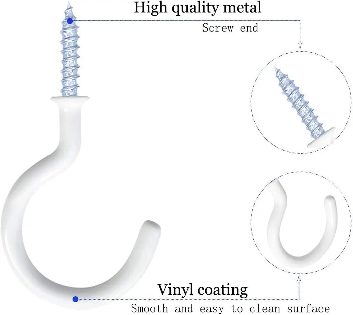 These coated hook screws are made of Vinyl and quality carbon steel, use easily, easy to mount into wood, drywall or other soft surfaces with sharp screw.