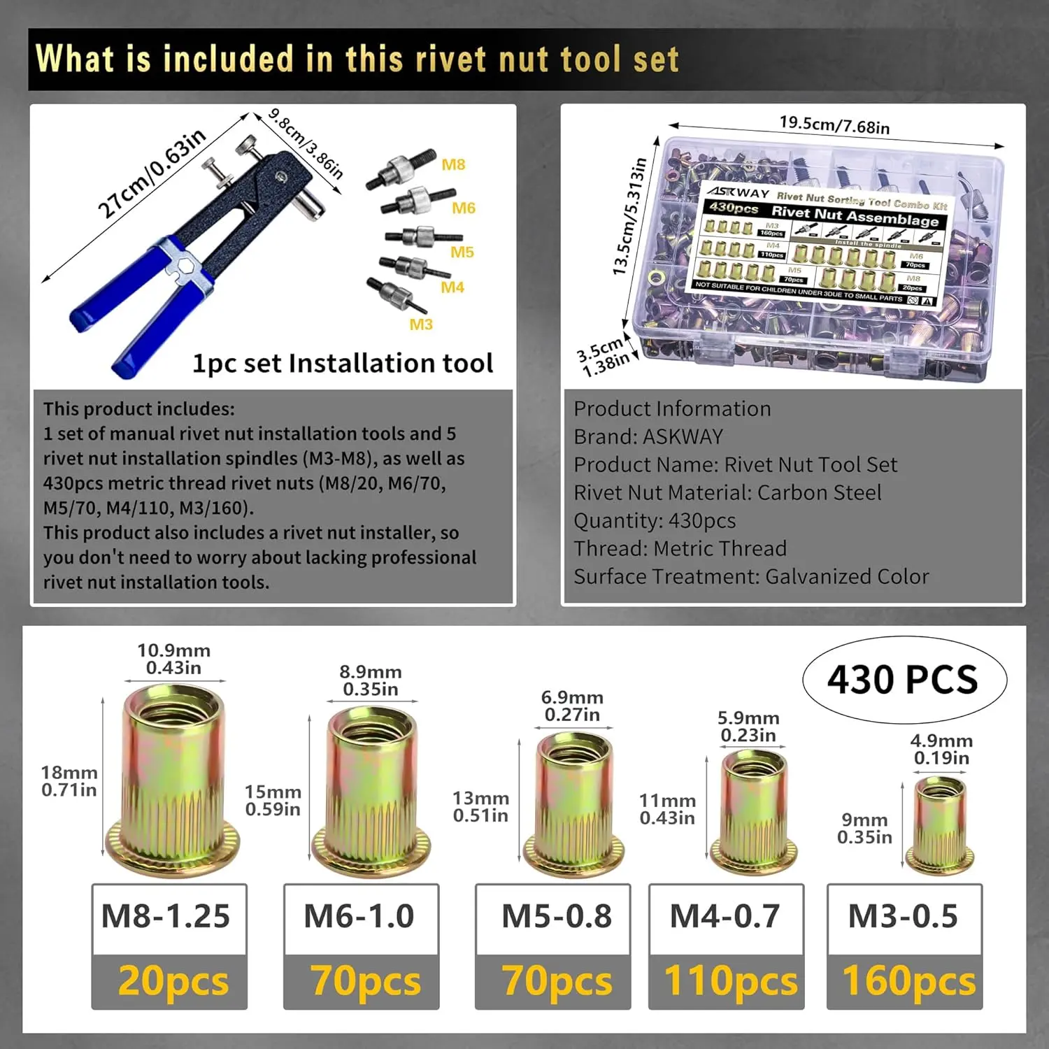 · Are installation tools provided? Yes, this rivet nut tool set includes 1 set of rivet nut installation tools and 430 PCS rivet nuts.You can perform riveting installation without purchasing additional rivet nut installation tools.