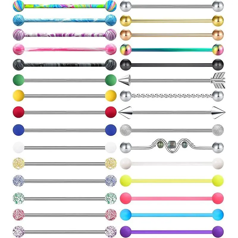 INDUSTRIAL RING SET: One order including 30pcs industrial barbell piercings(6 different styles, each style contains 5 different colors) & 1pcs black velvet jewelry bag, perfect match for all your outfits, bring you a colorful life