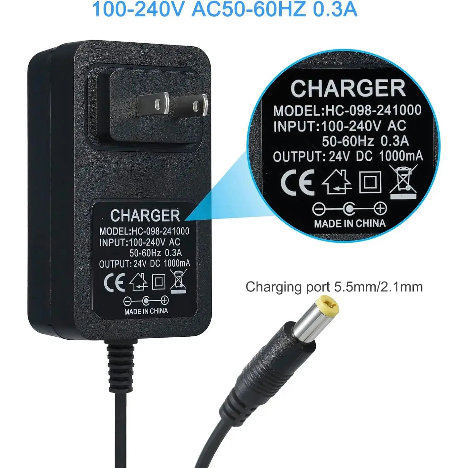 [AC Input /Output ]Input : 100V -240VAC 50/60Hz./Output:24VDC 1000MA / 5 Ft Power / 2.1mm x 5.5mm Center Positive Barrel Plug