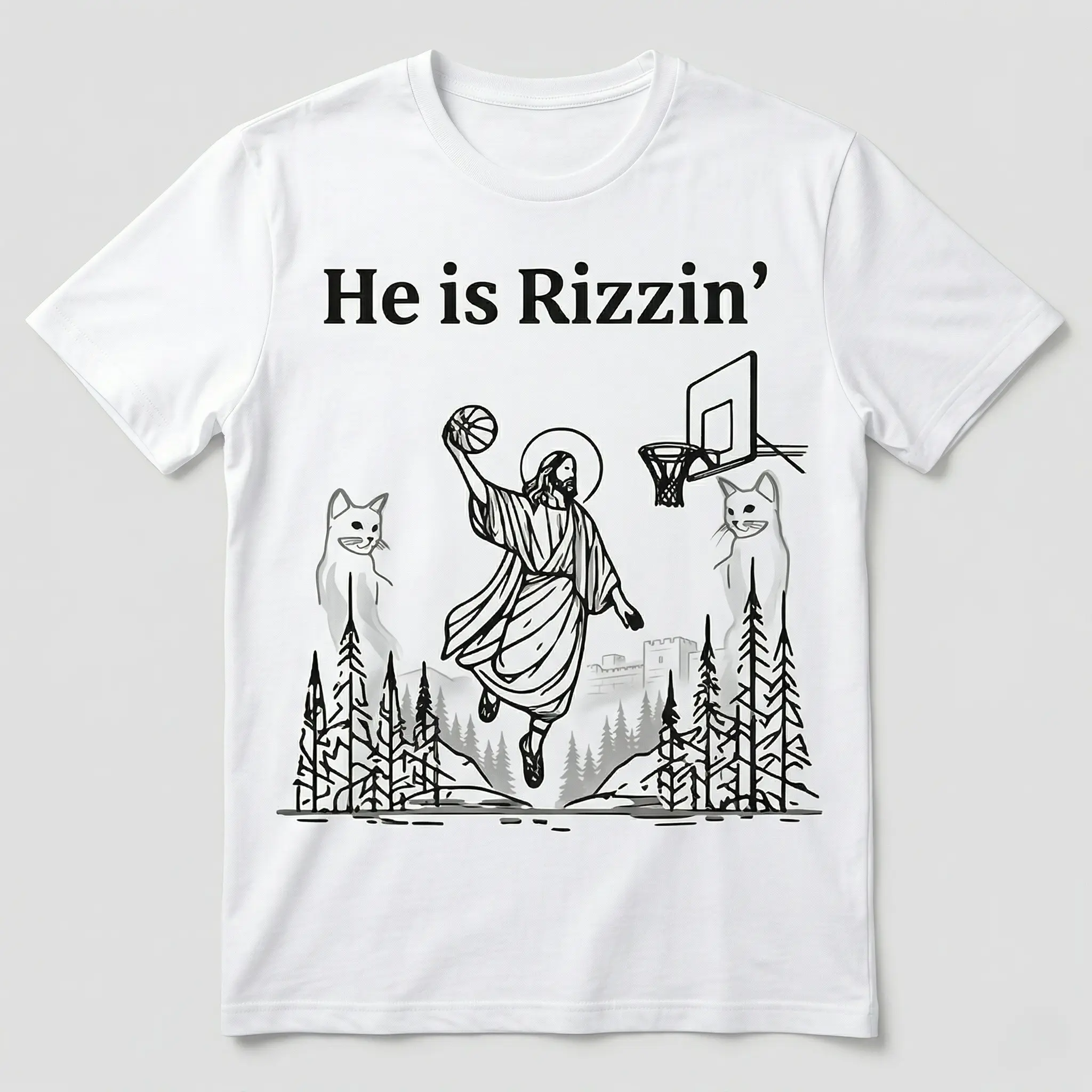 Funny He Is Rizzin' Men's T-Shirt 180g Pure Cotton Casual Jesus Basketball Graphic Tee Cat & Forest Meme Print Top for Gen Z Teens S-5XL