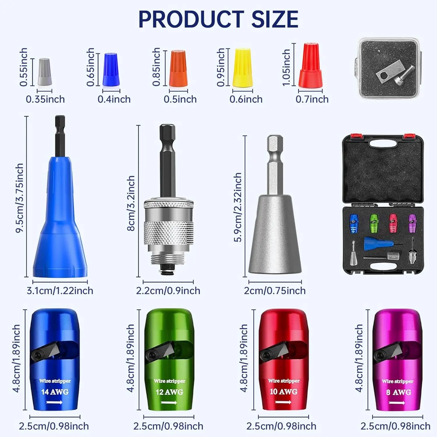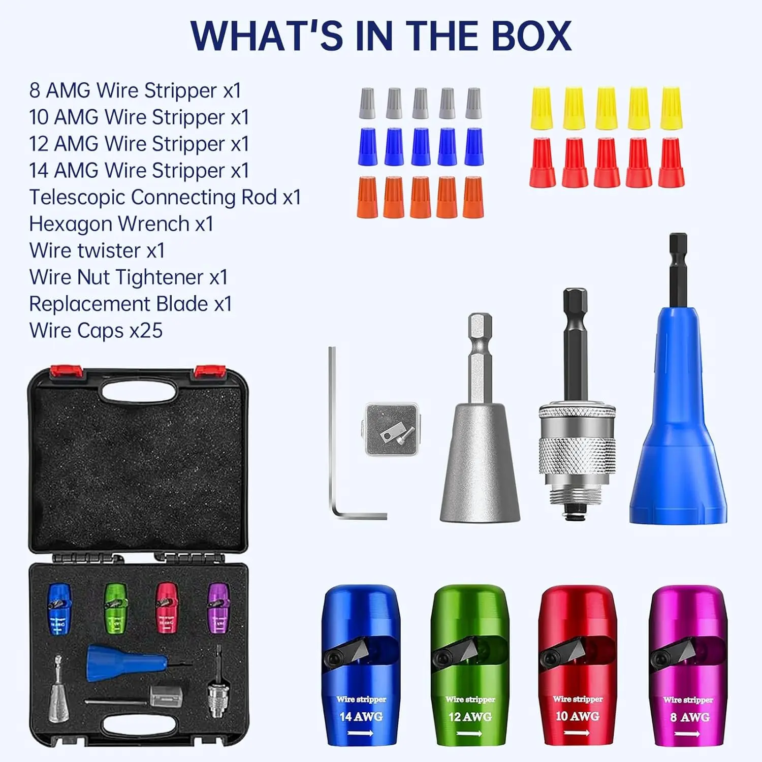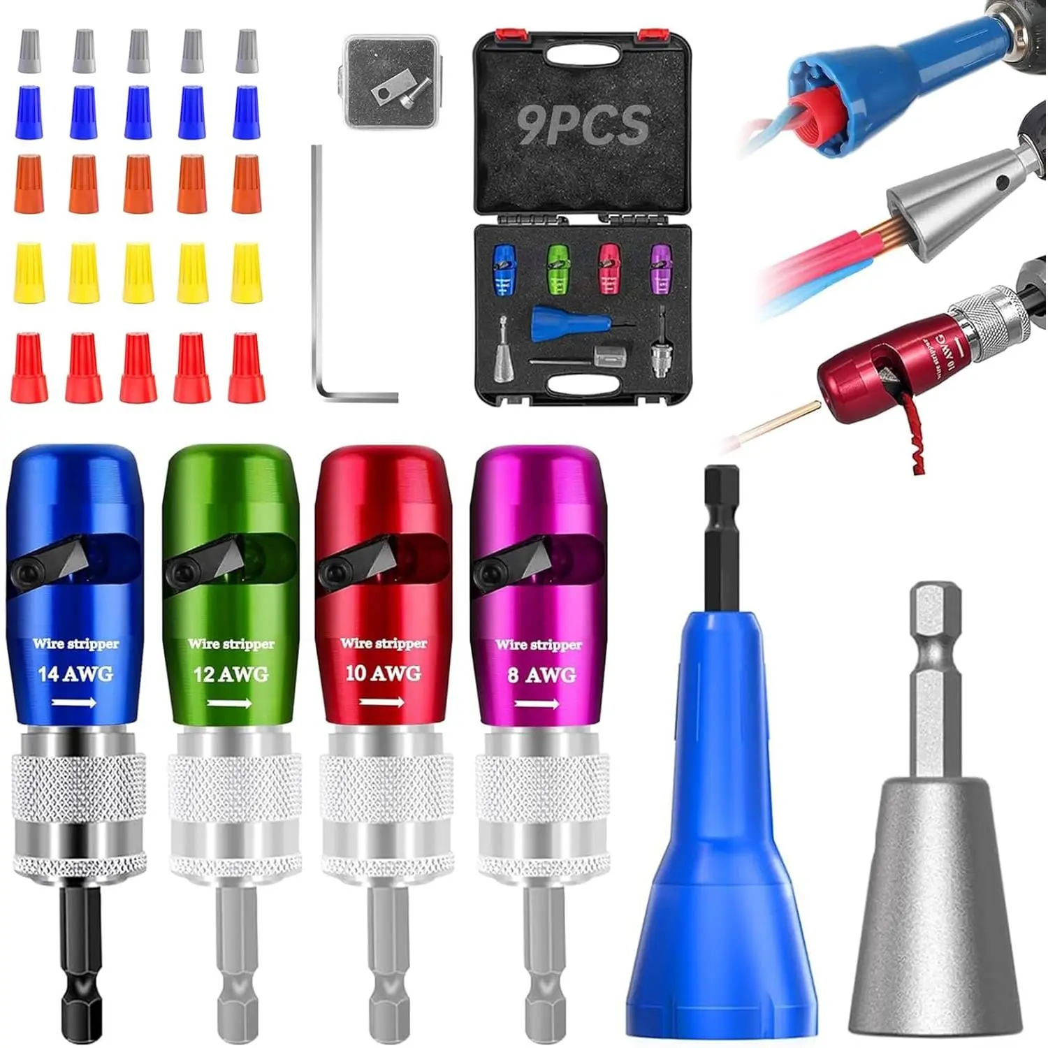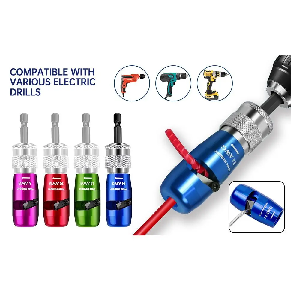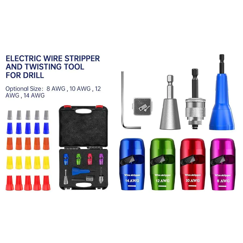 [US Regulations Drill Bit Wire Stripper] The new quick strip wire stripper in 2025. When wire twister tool for drill is used with an electric drill, the rubber insulation layer of the wire will be rotated and peeled along the groove of the wire stripper. wire stripper drill is more efficient and convenient than the old wire stripper. Applicable to 10AWG, 12AWG, 14AWG. [Professional Electrician Tool Set] wire stripping drill attachment is suitable for various types of soft wires and hard wires. It can effectively strip the insulation layer of wires and reconnect the tip parts. gadgets for electricians is widely used in wire splicing and wire recycling. fast wire twisting tool makes stripping and wiring work simpler and more efficient, saving you a lot of time. [Fast Wire Twister Tool for Drill] The entire body of drill wire twister is made of high-quality aluminum alloy, which is strong and durable. It has the advantages of high hardness, strong wear resistance and heat resistance, which increases the service life of electric wire strippers. [8-in-1 Tool Set] wire stripper and twister for drill is equipped with five wire strippers of different sizes, an electric drill connector, and Two different cable twistersthe five sizes of wire strippers can meet the use of many different types of wiresthe electric drill connector is used to connect an electric drill , and adjust the length of the stripped wiresthe wire twister can more conveniently connect the cut wires. Specification - This box contains wire strippers *4 (for AWG 14-12-10-8), wire stripper connecting rod * 1,L-shaped hexagonal wrench * 1, replacement blade * 1, silver Wire twister tool * 1, P1, P2, P3, P4, P6 size of wire caps * 5.