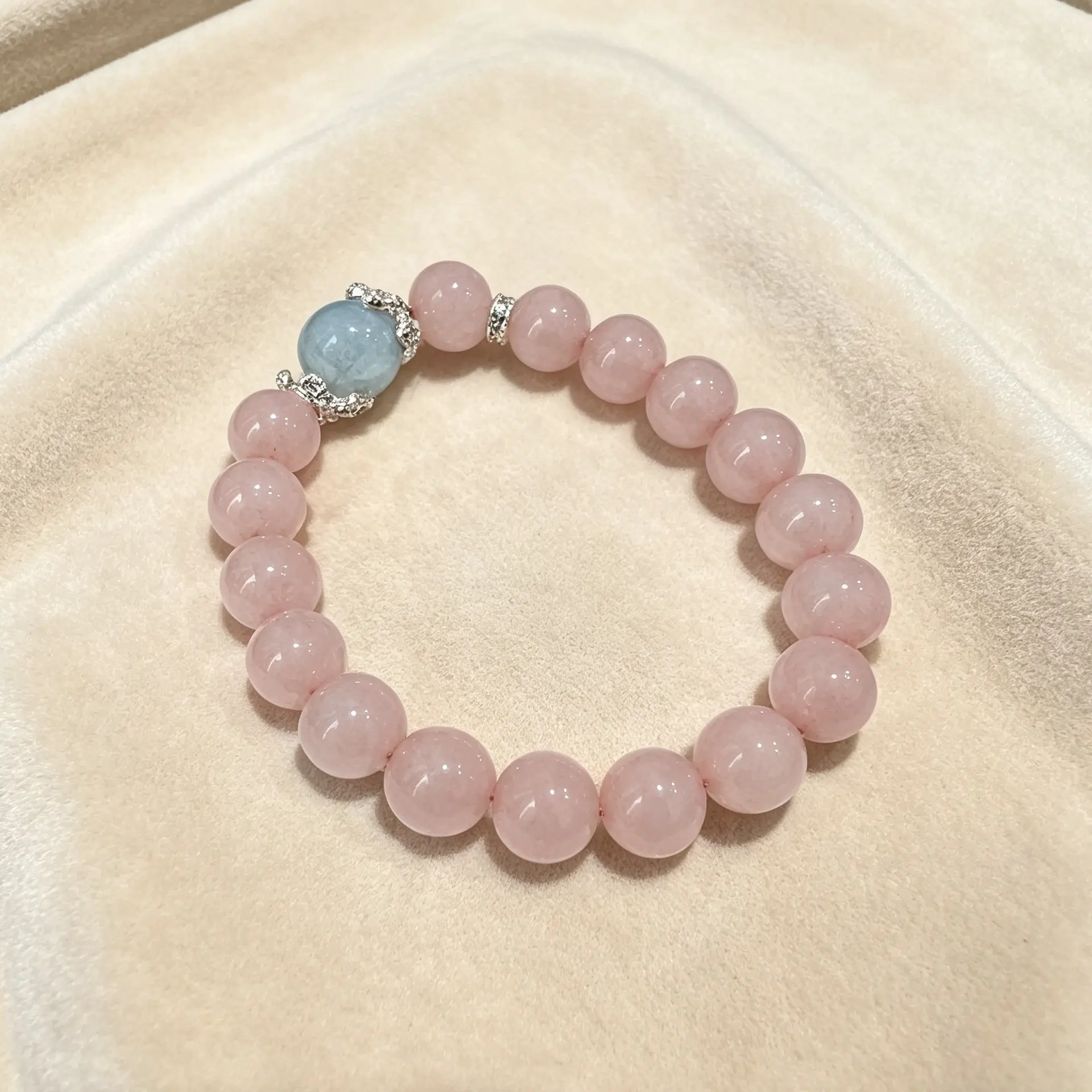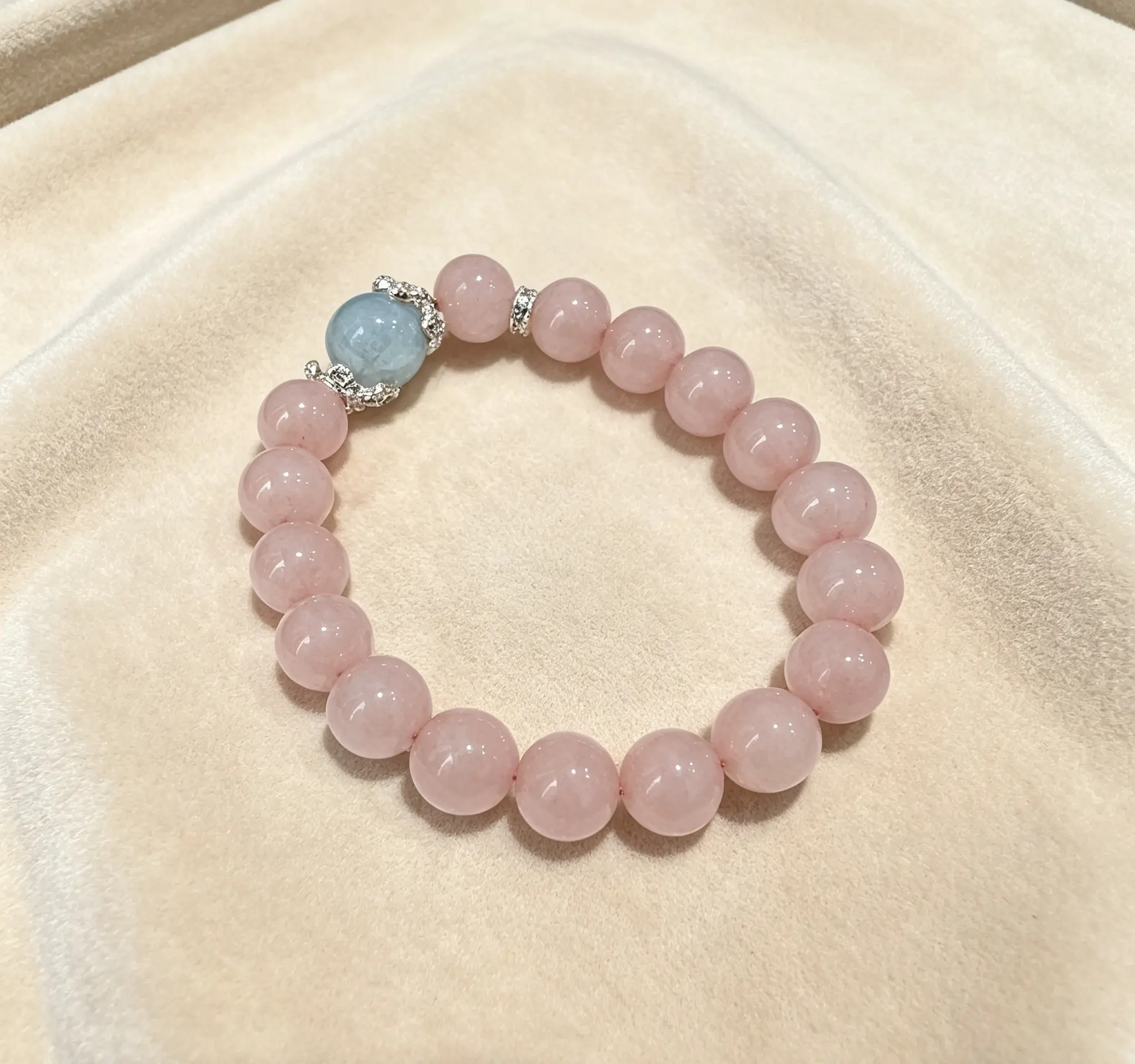 This lavish rose quartz bracelet with diamond accents is hand-strung with carefully selected tender rose quartz and sparkling diamond accessories, perfectly integrating the gentle healing temperament with the luxurious and gorgeous style. The whole bracelet weighs about 30g, with bead sizes ranging from 8 to 10mm. Since each natural crystal rough stone is one-of-a-kind, there will be slight variations in the size and weight of each bracelet. Wear it during daily commutes to help you relieve anxiety and heal your mood. Put it on during dinner parties or gatherings to add a gentle and luxurious vibe to you, bringing you peace and healing in daily life. Please note that each natural crystal is unique, and there may be slight differences between the actual product and the pictures. Please consider carefully before purchasing.
