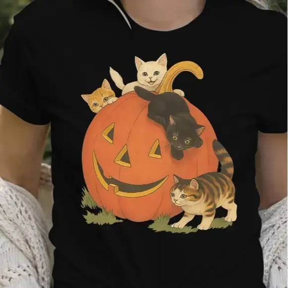 Retro 90s Cat Halloween Tee Featuring Vintage Jack-o-lantern Design Perfect for Fall Cat Lovers