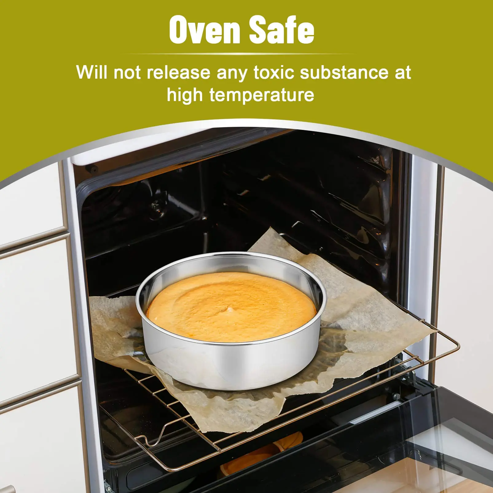[MULTI USE] Measured 8’’ Dia * 3’’ H, These cake pan can excellently baking in oven, Easy to deal with different food, Like baking bread, brownie, cake, Roasting lasagna, meat, veggies, Can be also used as fruit / snacks / nuts container and food serving pan, Great gift for friends who love baking