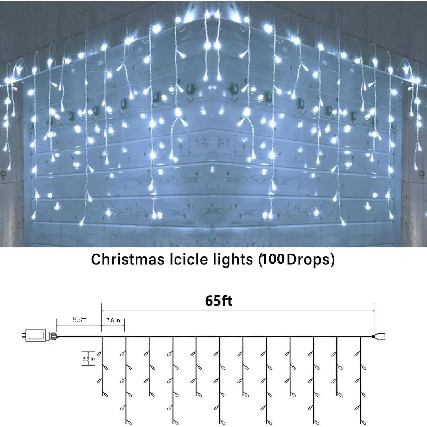 LED Icicle Lights, 65FT 8 Modes with 100 Drops, Icicle Fairy Lights for Holiday Christmas Decorations