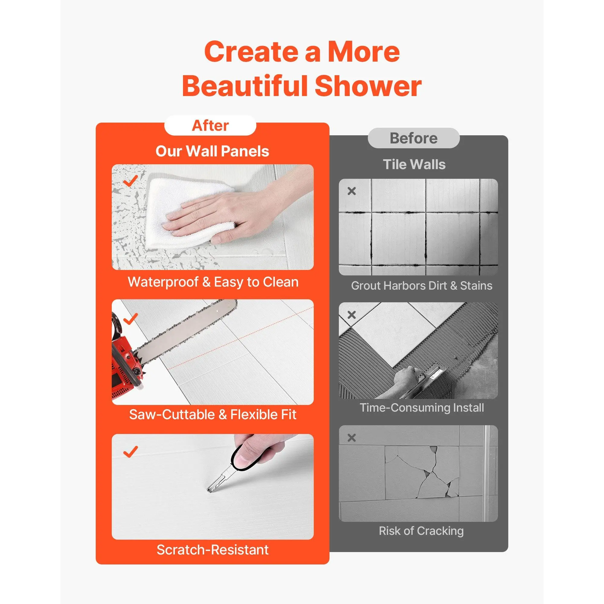 Designed for flexibility, these shower surround panels can be easily cut to match your shower or bathtub layout. Custom trimming ensures a precise fit that enhances the bathroom's clean, seamless, and modern appearance.