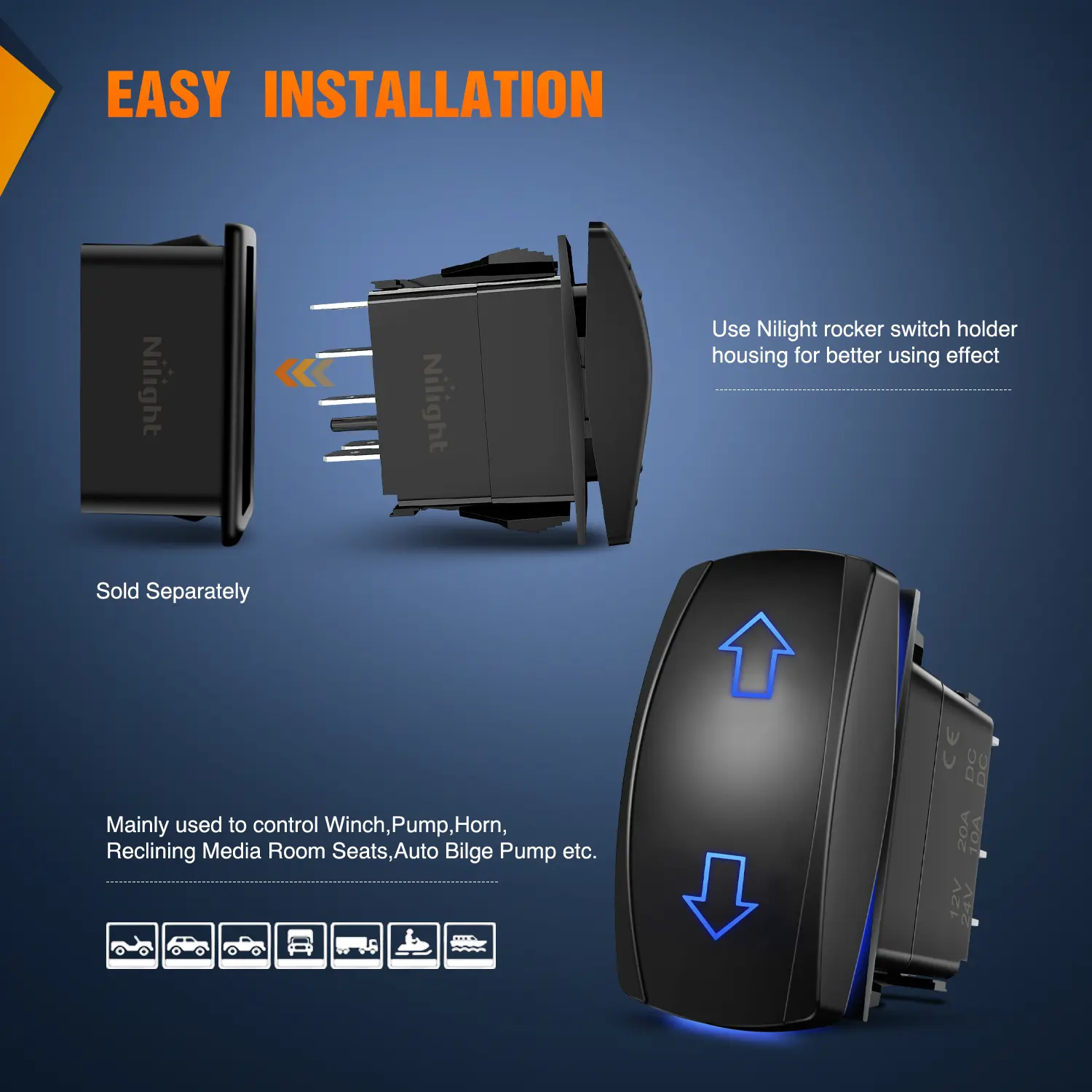 ·Wide range of application: Universal fit for all cars, RVs, SUVs, ATVs, UTVs, Cans, Buses, Marine boats, Yachts, Trailers, Jeeps, Prerunners, Campers, Caravans etc; Mainly used to control Winch, Pump, Horn, Reclining Media Room Seats, Auto Bilge Pump or led light bar, led work lights, fog lamps, headlights, taillights and auxiliary lamps, etc.
