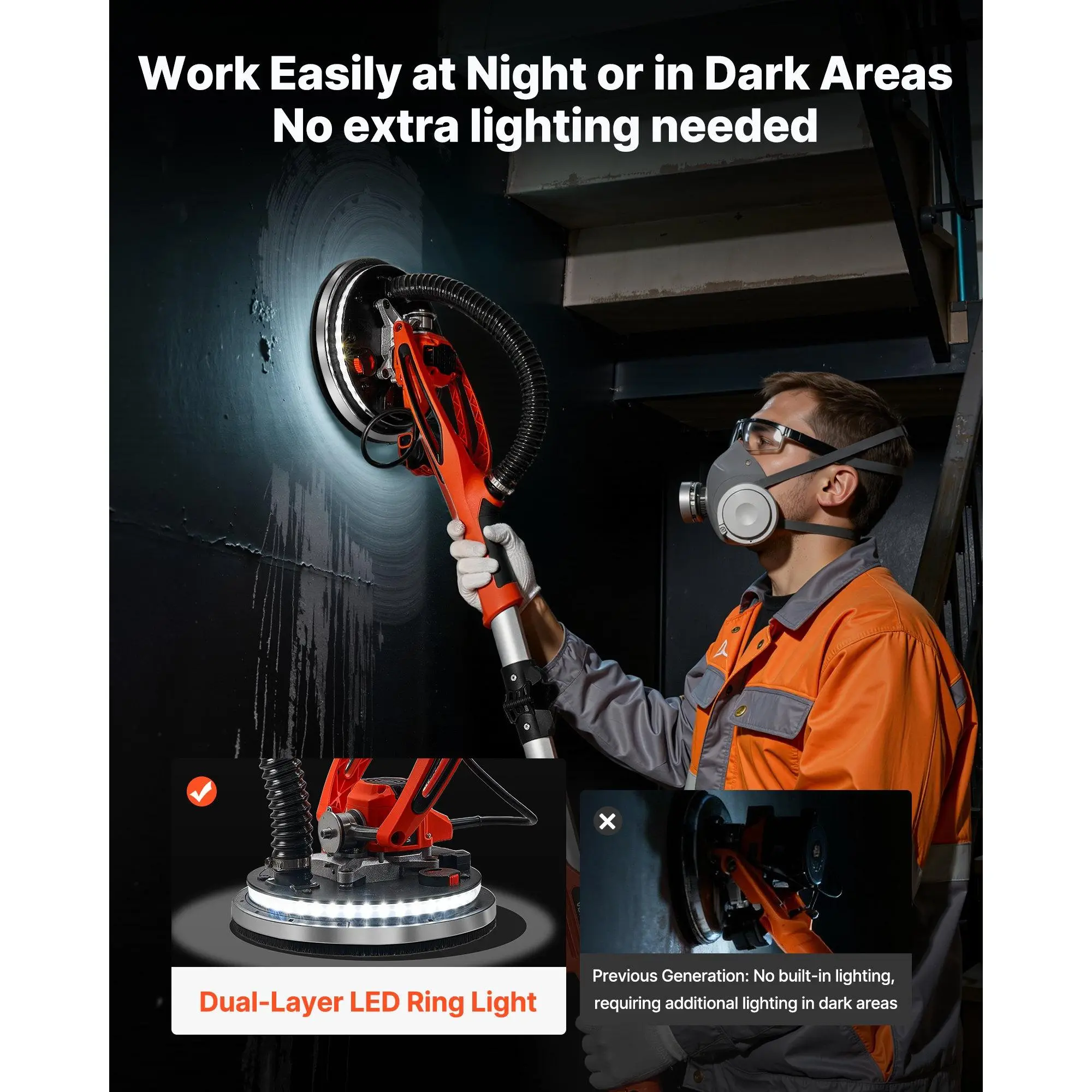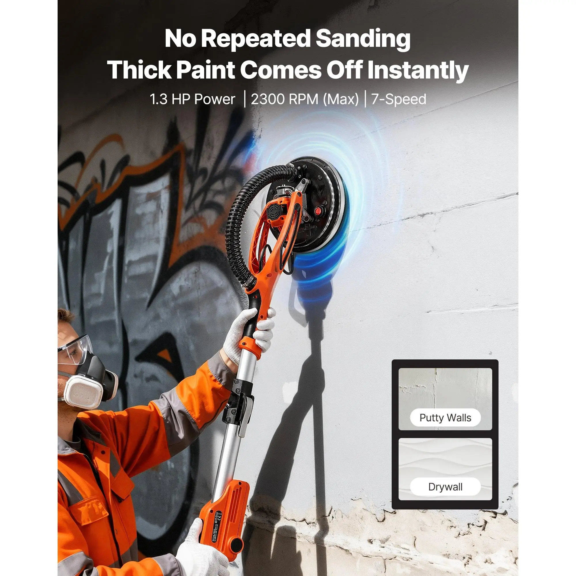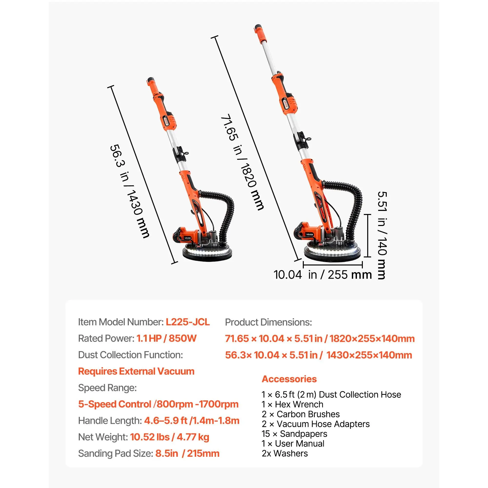 VEVOR Drywall Sander, 950W Electric Drywall Sander, Popcorn Ceiling Removal Tool with 7 Variable Speed 1000-2300 RPM, Double-Deck LED Light, Foldable Extendable Handle, 15 Sanding Discs, Dust HoseMulti-Speed Control360 LED LightingDetachable Disc EdgePowerful PerformanceVersatile UseComplete AccessoriesHandle Length: 4.6-5.9 ft/ 1.4-1.8 m, Dust Collection Function: Requires External Vacuum, Product Dimensions (Pole Extended): 70.87x 10.04x 5.31 in/ 1800x 255x 135 mm, Item Model Number: WS225-KCL, Rated Power: 1.3 HP/ 950W, Product Dimensions (Pole Retracted): 55.71x 10.04x 5.31 in/ 1415x 255x 135 mm, Speed Range: 7-Speed Control, 1000 RPM-2300 RPM, Net Weight: 11.68 lbs/ 5.3 kg, Sanding Pad Size: 8.5 in/ 215 mm