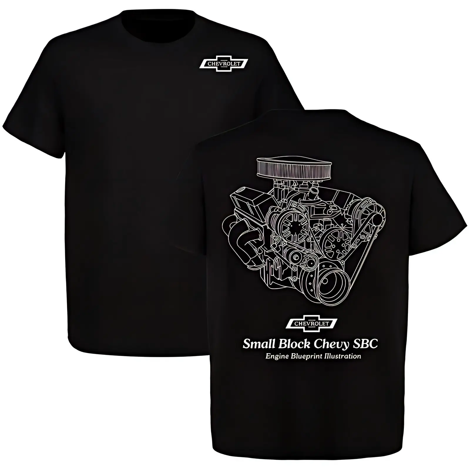 Small Block Chevy SBC Engine Blueprint Illustration T-shirt – Detailed Muscle Car Design, Premium Cotton, Perfect for Chevy Fans & Engine Enthusiasts, Vintage Style