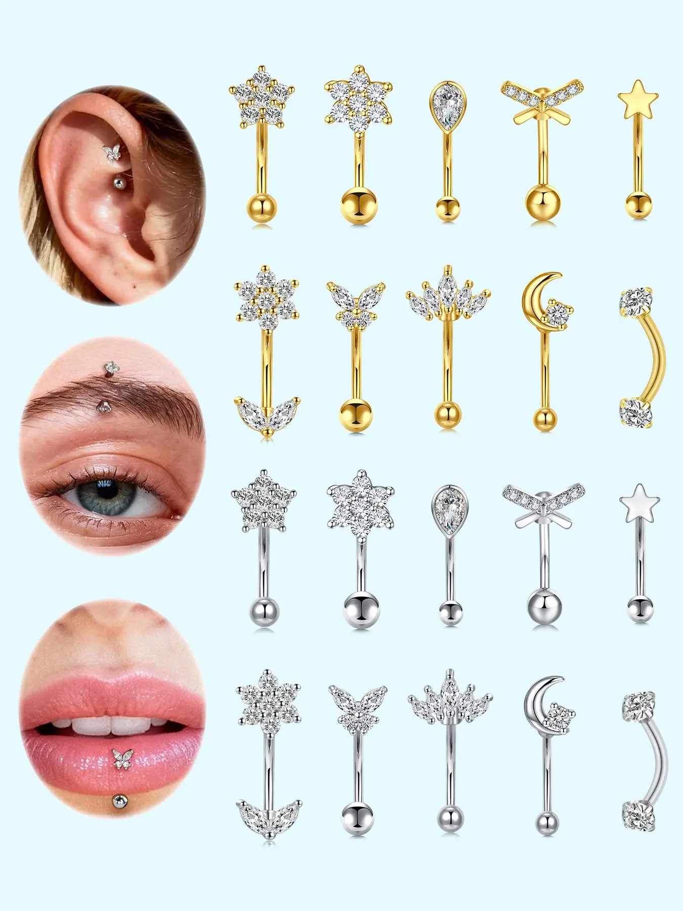 【Diverse Pieces】: Includes eyebrow rings, vertical lip rings, and ear cartilage earrings for various piercing styles.