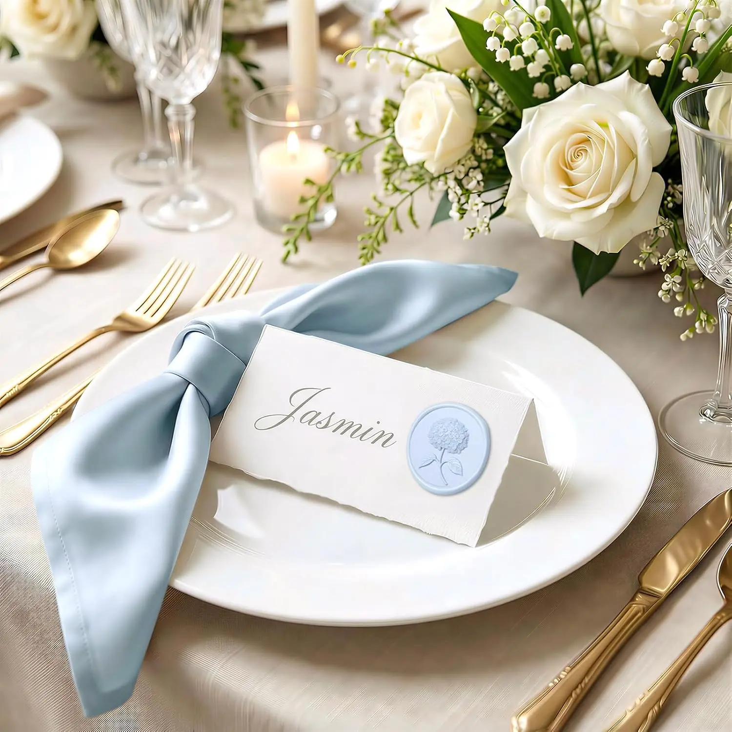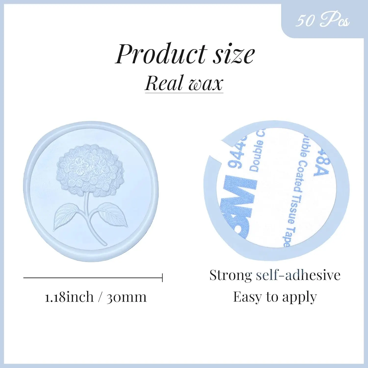 These wax seal stickers support direct application after removing the adhesive backing. No extra tools or heating steps are needed for usage. The backing adhesive provides stable bonding strength with a sufficient contact area, allowing the stickers to stay attached during mailing and daily handling. The product is constructed using real wax material, with a three‑dimensional floral surface for a textured appearance. Multiple color selections include light blue and dusty blue, along with various patterns such as hydrangea, eucalyptus leaf, magnolia, baby's breath, floral, bow, and wildflower designs. Each package contains 50 pieces, and each sticker measures 1.2 inches or 30 mm in diameter. These stickers are suitable for use on invitations, gift wrapping, and seasonal decorations including Christmas.