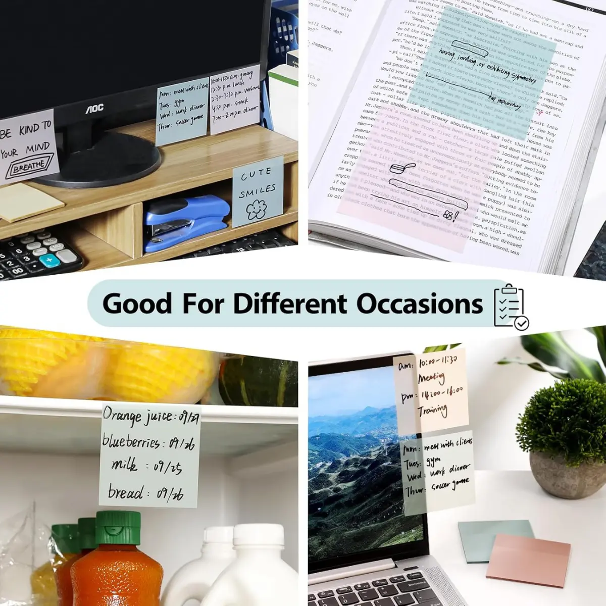 ·Multi-Pen Type for Smooth Writing: Transparent sticky notes have a smooth writing experience. Suitable for ballpoint pens, pencils, markers, oil-based pens, but not recommended for fountain pens and gel pens.