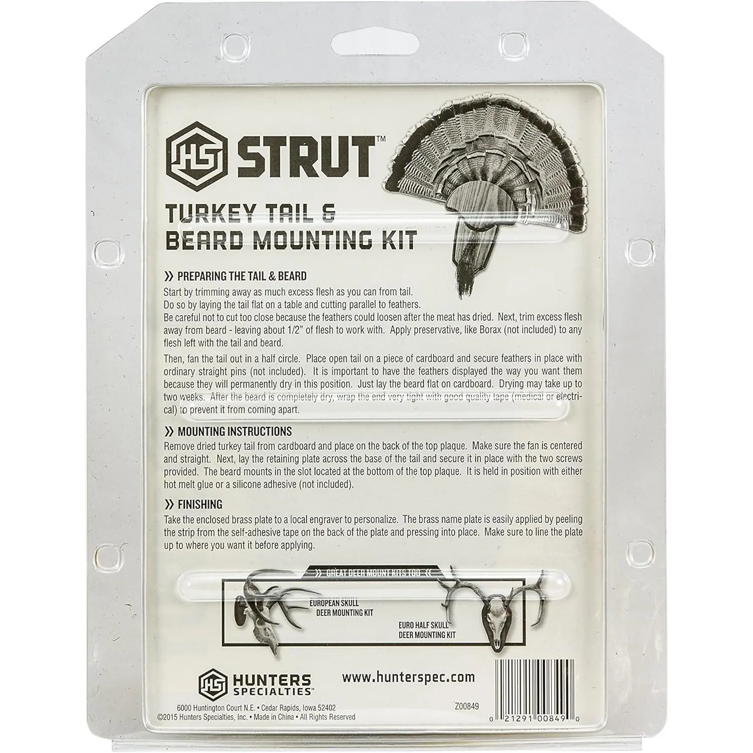 HUNTERS SPECIALTIES TURKEY TAIL & BEARD MOUNTING KIT By mounting your own trophy, you save money and get it up on the wall faster. Our easy-to-assemble mount kit comes with a mounting plaque and hardware, a brass nameplate, and easy-to-follow instructions. FEATURES: - Professional look without large price tag; - Easy to assemble; - Includes all mounting hardware & brass name plate; - Perfect for any turkey species. MOUNTING INSTRUCTIONS: Place the dried turkey tail on the back of the top plaque. Make sure the fan is centered and straight. Next, lay the retaining plate across the base of the tail and secure it in place with the two screws provided. The beard mounts in the slot located at the bottom of the plaque. It is held in position with either hot melt glue or a silicone adhesive (not included). FINISHING: Take the enclosed brass plate to a local engraver to personalize. The brass name plate is easily applied by peeling the strip from the self-adhesive tape on the back of the plate and pressing into place. Make sure to line the plate up to where you want it before applying.