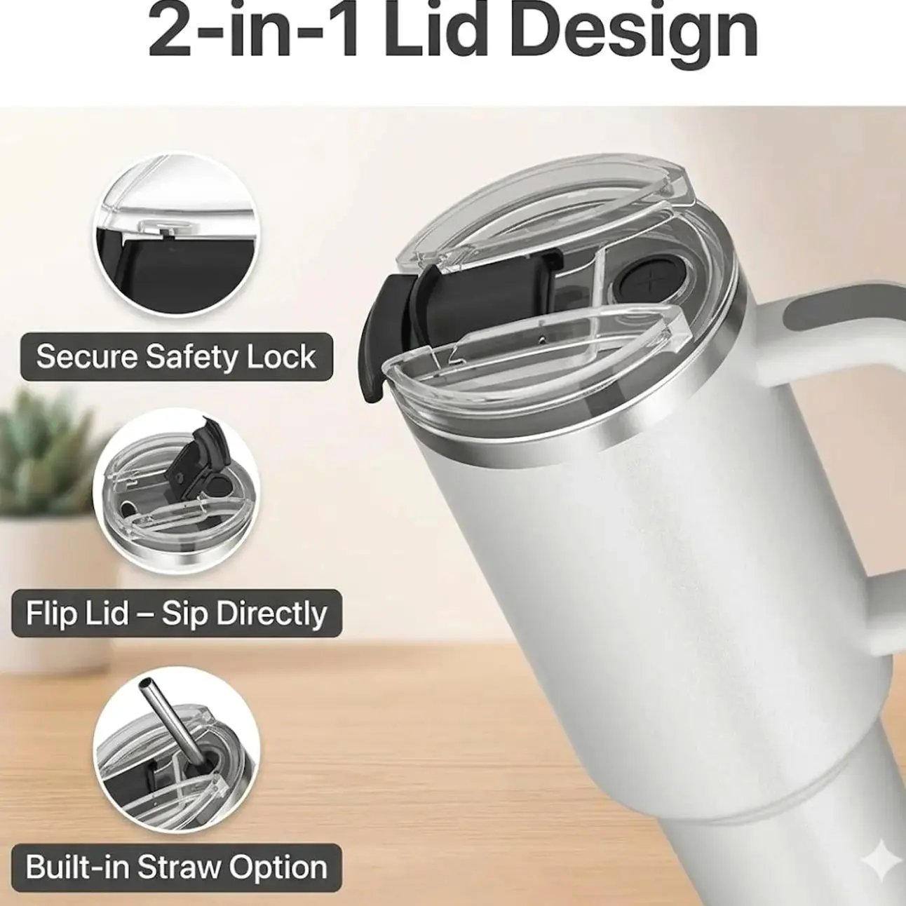 The versatile lid gives you options: use the included reusable straw for easy sipping, use the wide-mouth opening for chugging, or rotate it to the full-cover top to prevent splashes and spills.