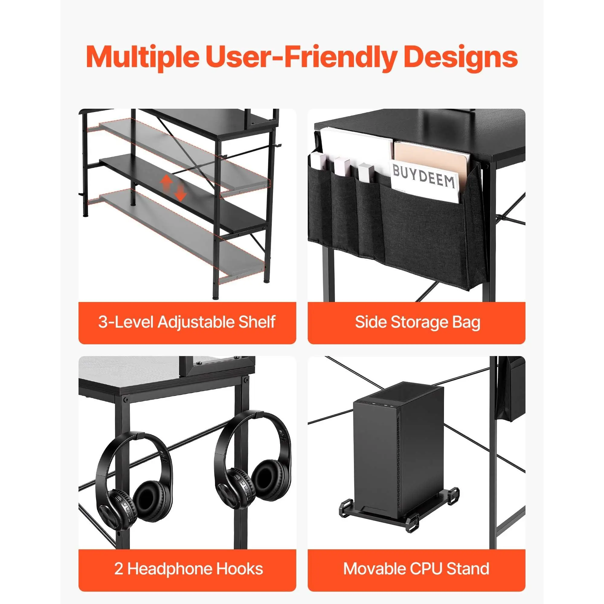Features a two-tier top shelf and a 3-level adjustable bottom shelf, this gaming PC desk provides ample space to organize books, accessories, and essentials, keeping your desk tidy and items within easy reach.