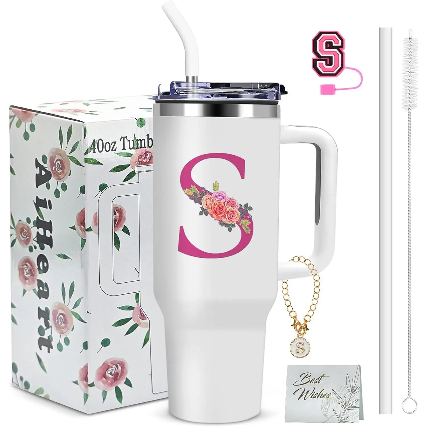 SANDJEST Stainless Steel 40oz Tumbler with Handle & Straw, Reusable Large Capacity Thermos Cup, Hot Cold Insulation, Office Home Spring Mother's Day Gift