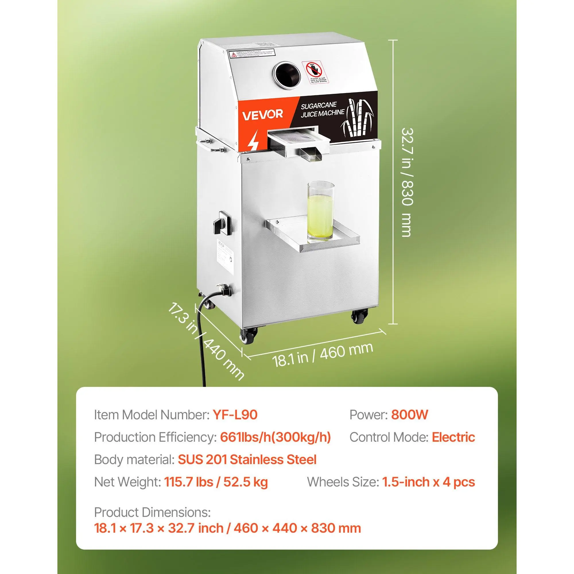 Elevate your juicing experience with VEVOR Electric Sugar Cane Juicer! Our sugarcane juicer boasts 800W high power motor and 3 stainless steel rollers, delivering up to 661LBS/H of sugarcane juice output. Crafted entirely from durable stainless steel, it ensures longevity and easy maintenance.