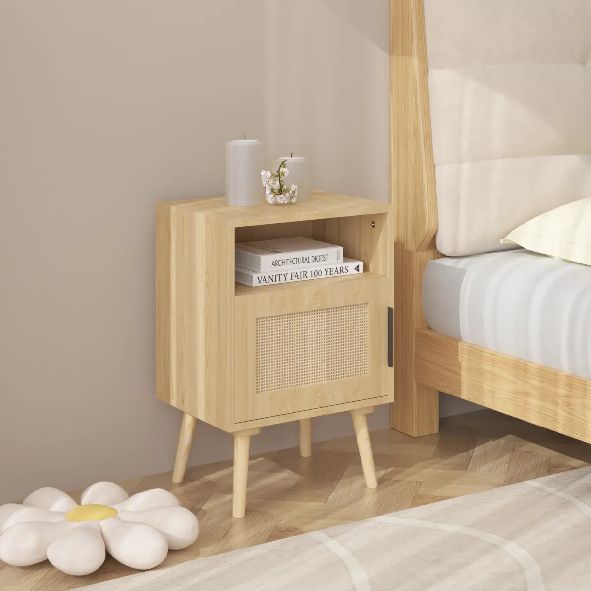 ·A Spacious tabletop, rattan decor door, and open shelf can meet your storage needs.The natural wood nightstand is made of sturdy wood boards and high-quality beech legs.Its chic legs also bring a touch of visual appeal.It is reinforced by special screws to ensure its durability and stability, which can accompany you for many years.