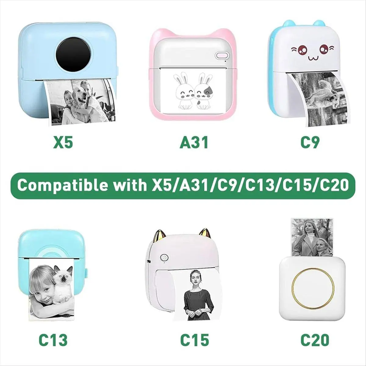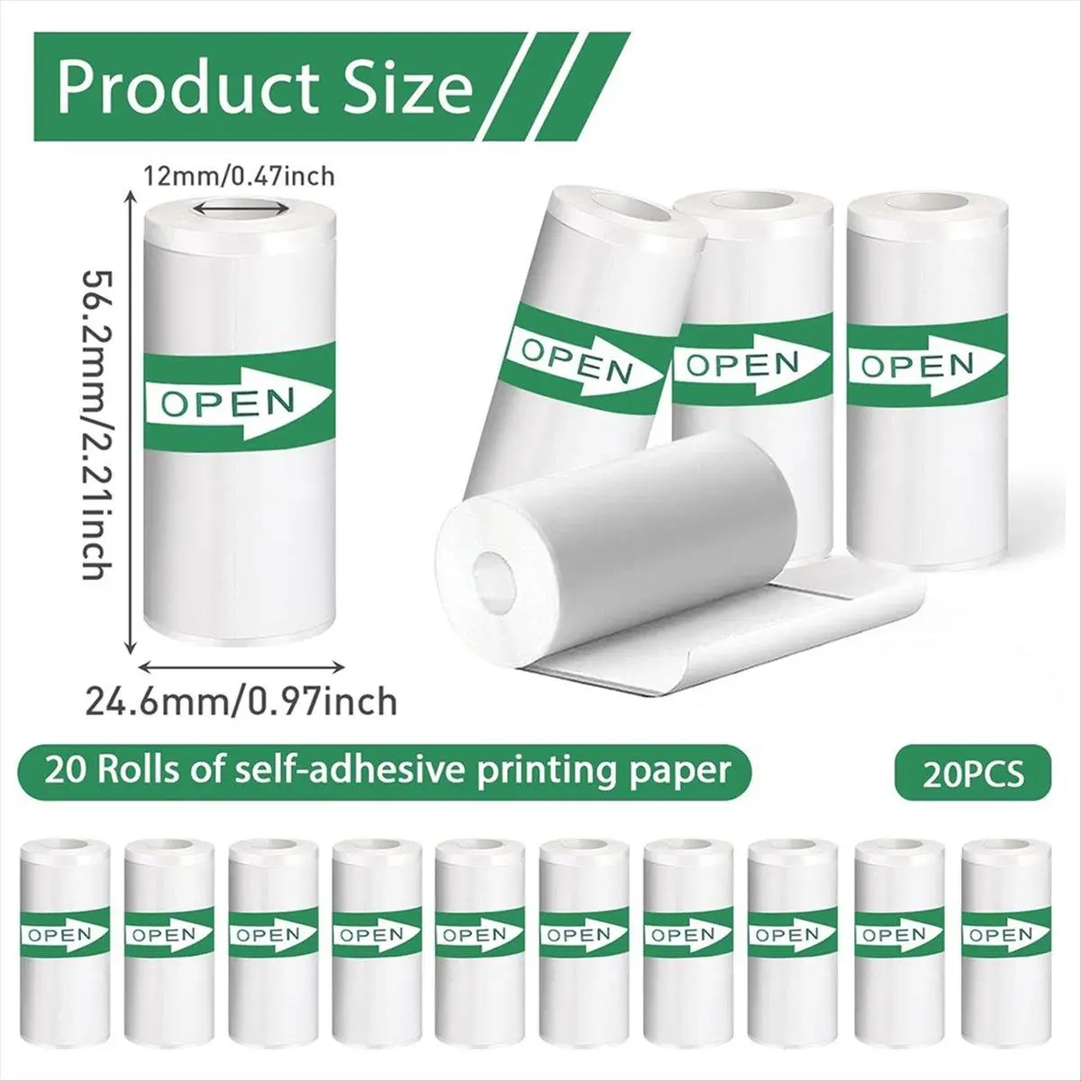 Package includes: You will receive 20 rolls of self-adhesive thermal printer paper, with dimensions of 5.7 cm x 2.5 cm. Installing and using this printer is very easy. Just pay attention to the correct installation direction and you can easily print beautiful photos.