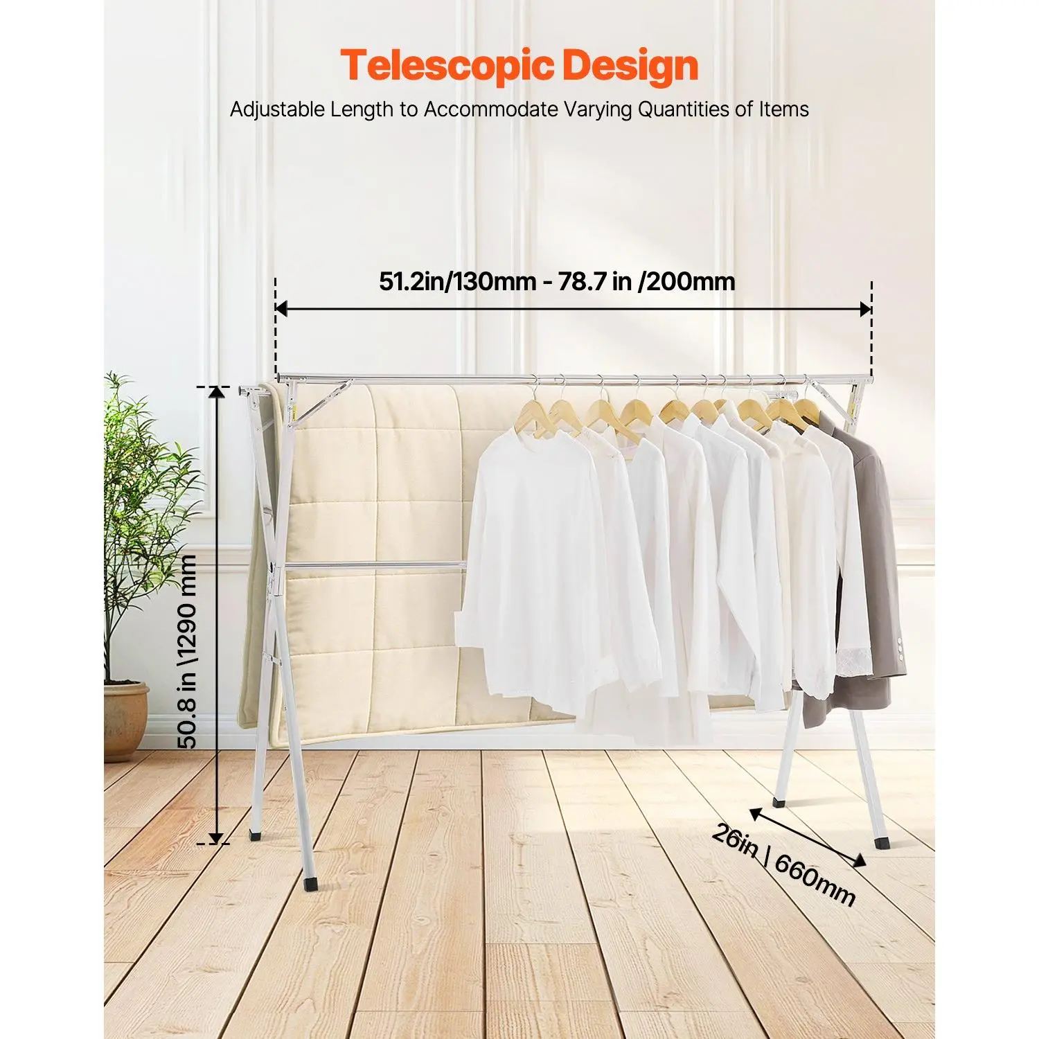 Featuring a spacious two-tier design, it provides ample space for hanging and drying. Made from durable stainless steel, it is rust- and corrosion-resistant, with a weight capacity of 121.2 lbs/ 55 kg. The adjustable length (51.2-78.7 inches/ 1.3-2m) suits various drying needs.