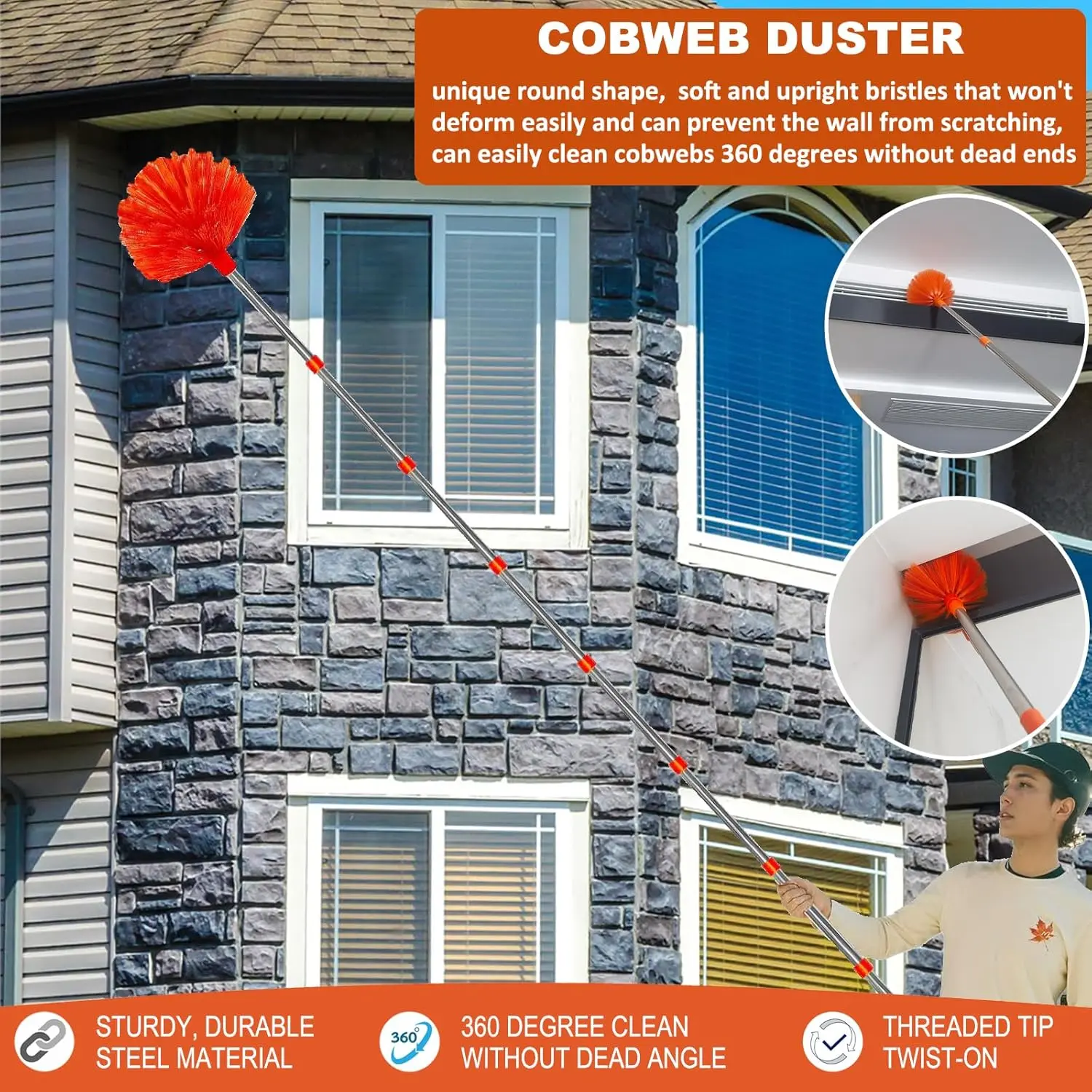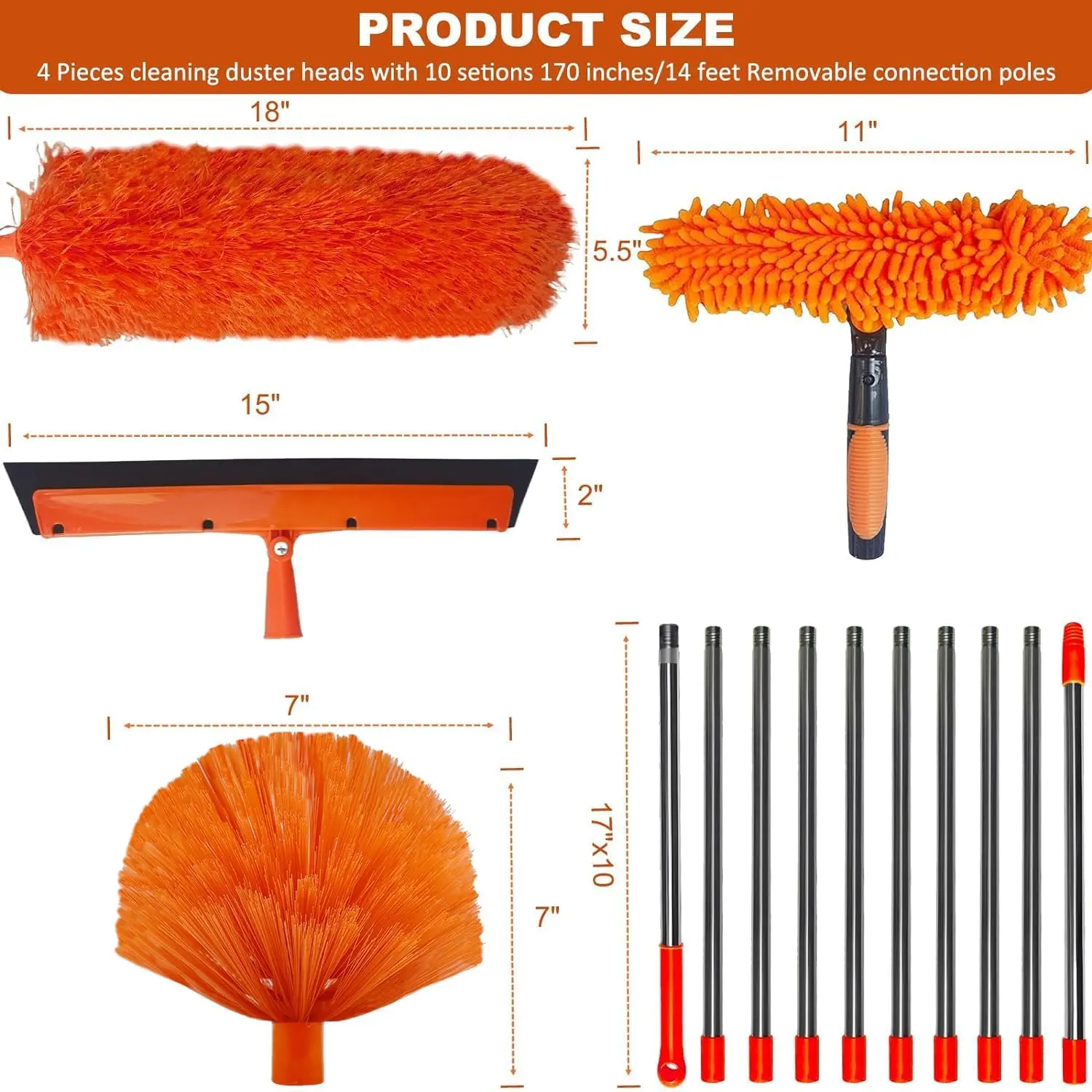 3-Piece ALL-INCLUSIVE extendable duster kit for high ceilings gives you up to 20 ft of reach, making all your hard-to-reach tasks super easy. This set includes a 14 ft extra-thick aluminum telescopic pole, 1 x cobweb duster, 1 x microfiber feather duster, 1 x 2 in 1 chenille cleaning duster head and 1 x Window Squeegee. If your home has high ceilings, floor-to-ceiling windows, or other difficult-to-clean areas, our cleaning duster kit is the ultimate answer for a tidy home environment.