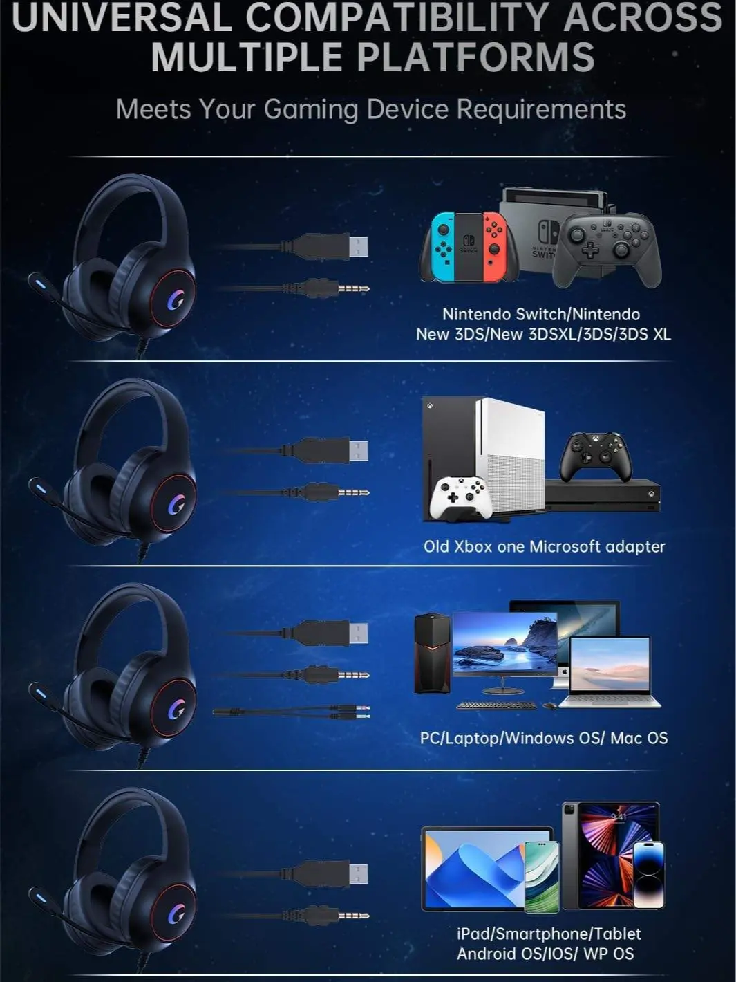 ·Please NOTE: 1.If you don't hear any sound when using the gaming headset for the first time, check if the mute button is on, and turn it off if necessary. 2.When using an older version of the Xbox controller, you will need an adapter to connect the headset. Otherwise, the volume of the gaming headsets will be low and accompanied by static noise. 3.The USB port on the headphones is just for PC hosts and provides power for the headsets' RGB lighting. 4.The gaming headset can be used for switch, but the microphone will not function due to limitations of the console, not because of a defect in the headset