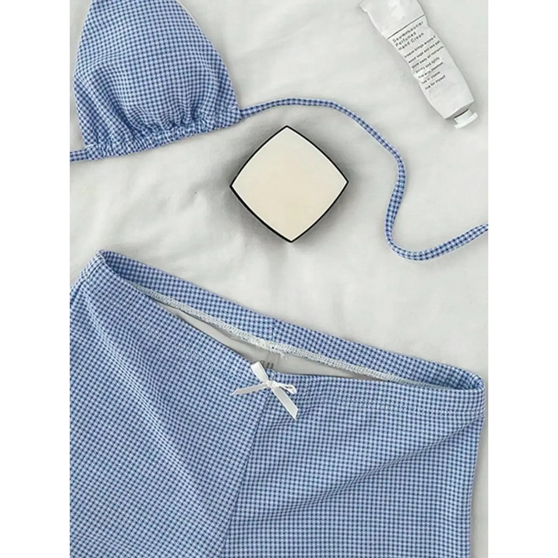 Sweet Girl Blue Plaid Halter Triangle Bikini Set, Fitted Two-Piece Swimsuit for Vacation Sunbathing, Cute Style All Seasons, Swimwear Set, Swimsuit Sets