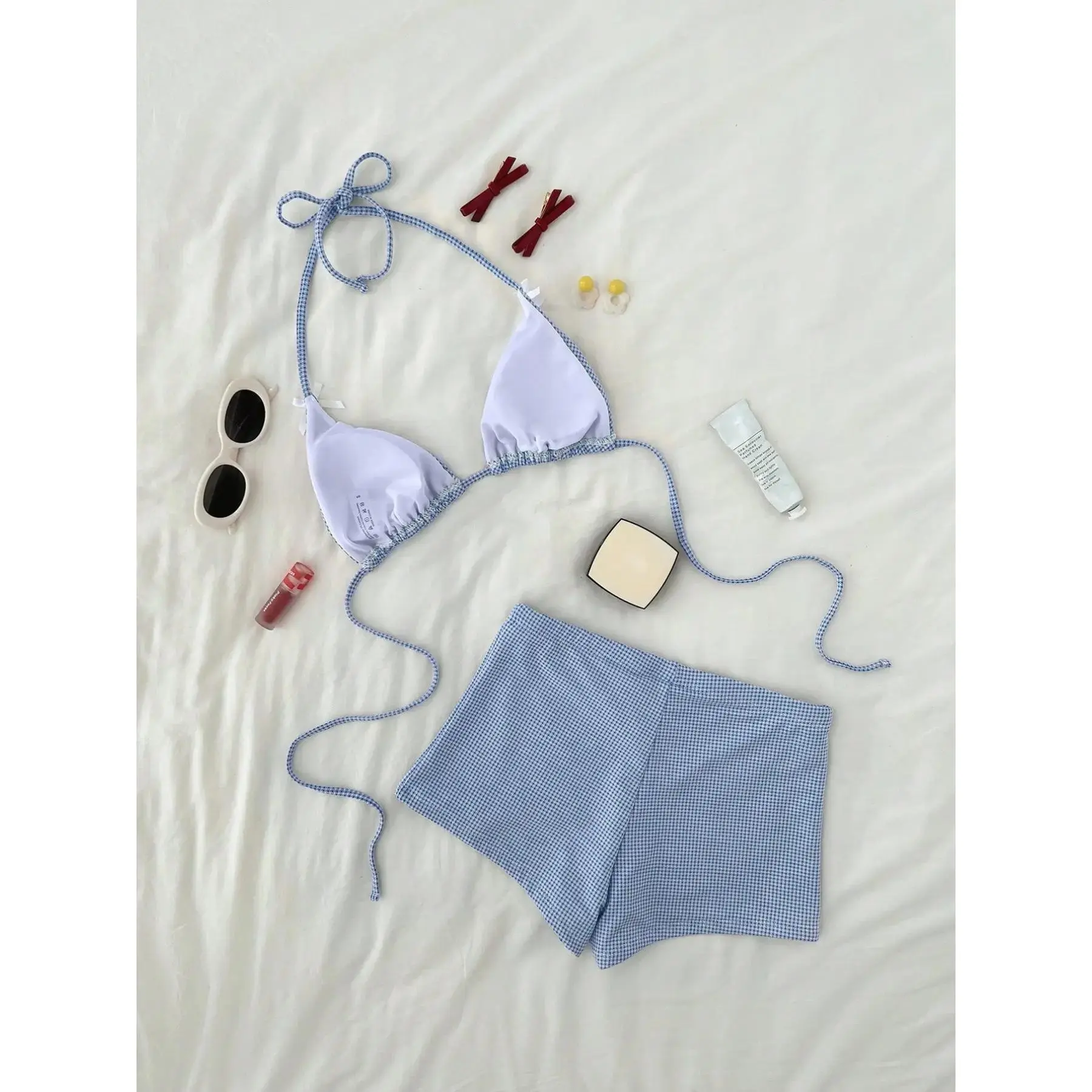 5. Sweet Girl Blue Plaid Halter Triangle Bikini Set, Fitted Two-Piece Swimsuit for Vacation Sunbathing, Cute Style All Seasons, Swimwear Set, Swimsuit Sets