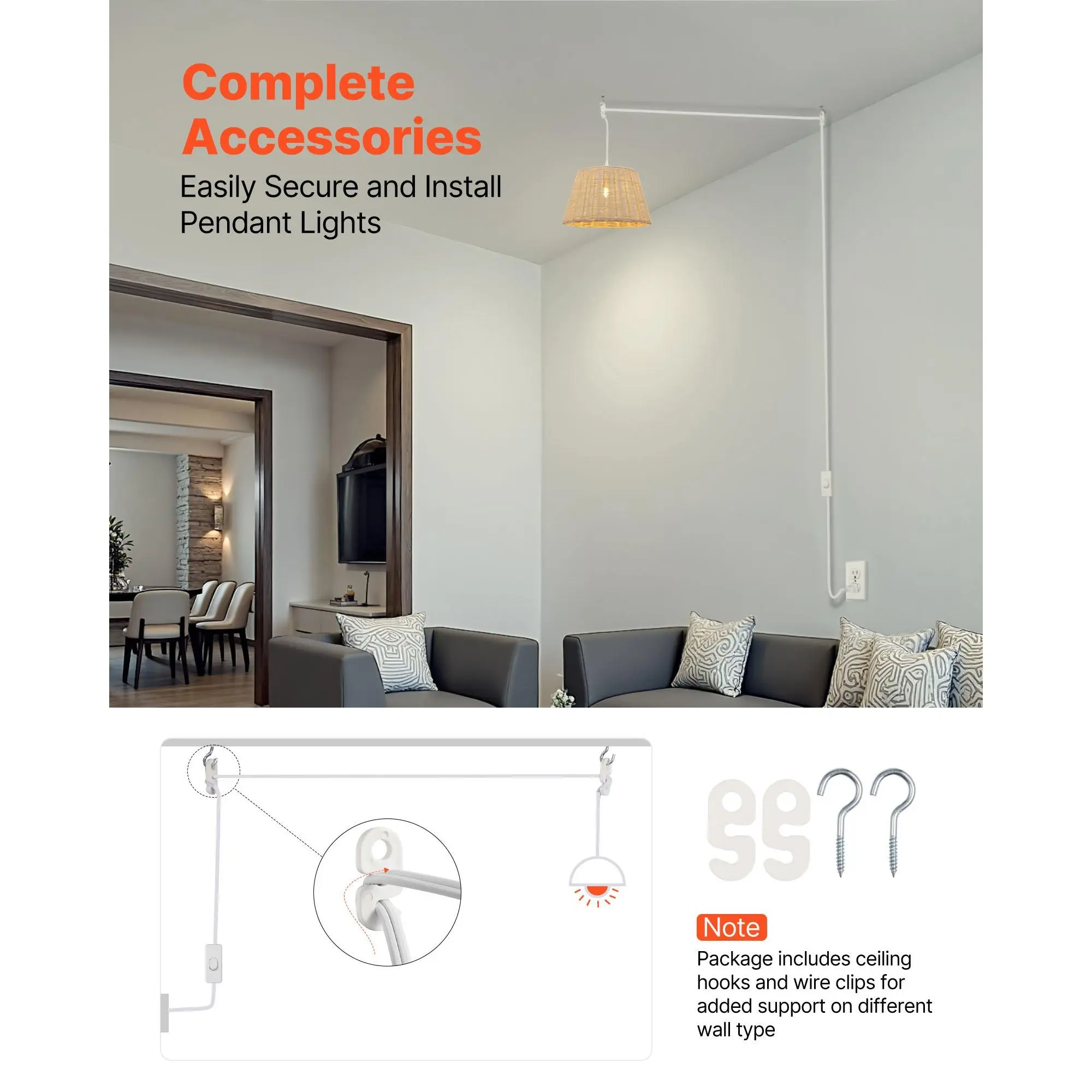 The simple white finish blends into different settings. Whether in a cozy bedroom, spacious living room, lively outdoor party, or open-air gathering, this hanging lamp cord fits seamlessly. It not only provides practical lighting but also adds elegance to the space.
