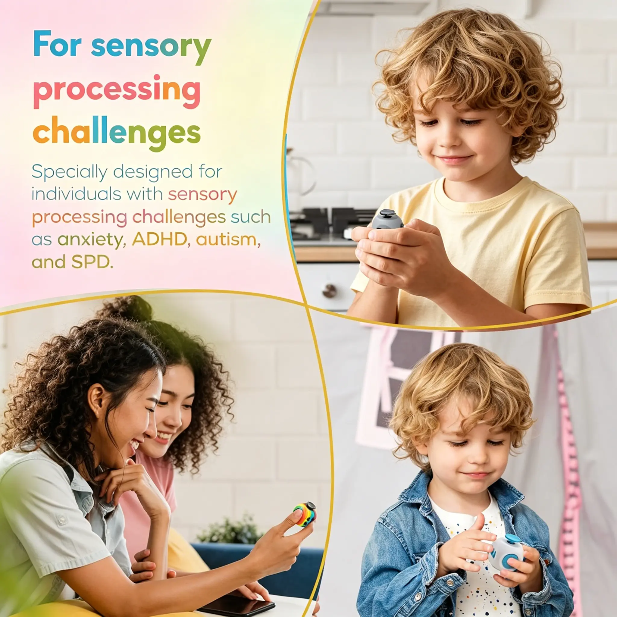 Whether in class or meetings, our fidget cube lets you fidget discreetly for both kids and adults. It features 4 silent sides, semi-silent buttons, and an audible switch for satisfying tactile and auditory feedback.