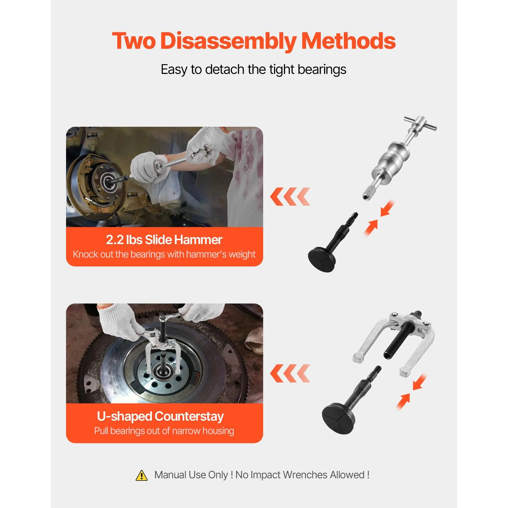 Our slide hammer bearing puller has two flexible methods for detaching fastening bearings. The sliding hammer efficiently detaches parts, while the U-shaped counterstay easily navigates narrow spaces to pull out bearings effectively.