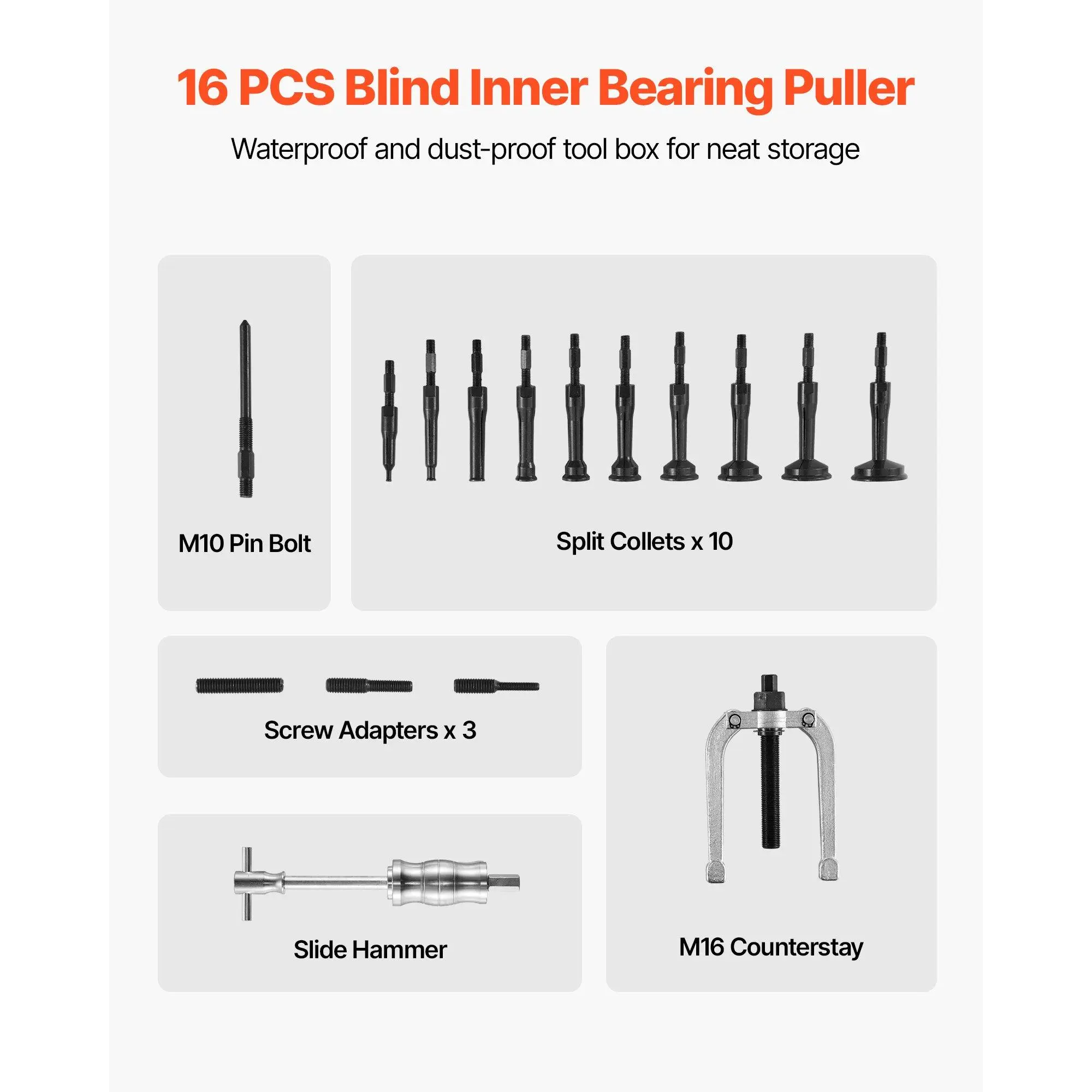 Designed for most vehicles, this slide hammer puller set comes with 10 collet sizes, covering 1/4 to 2-1/3 in (6-59 mm) bearings, shafts, bushings, and more. The hammer-and-collet setup allows for quick impact pulling, while the U-shaped counterstay reaches deep into tight spaces.