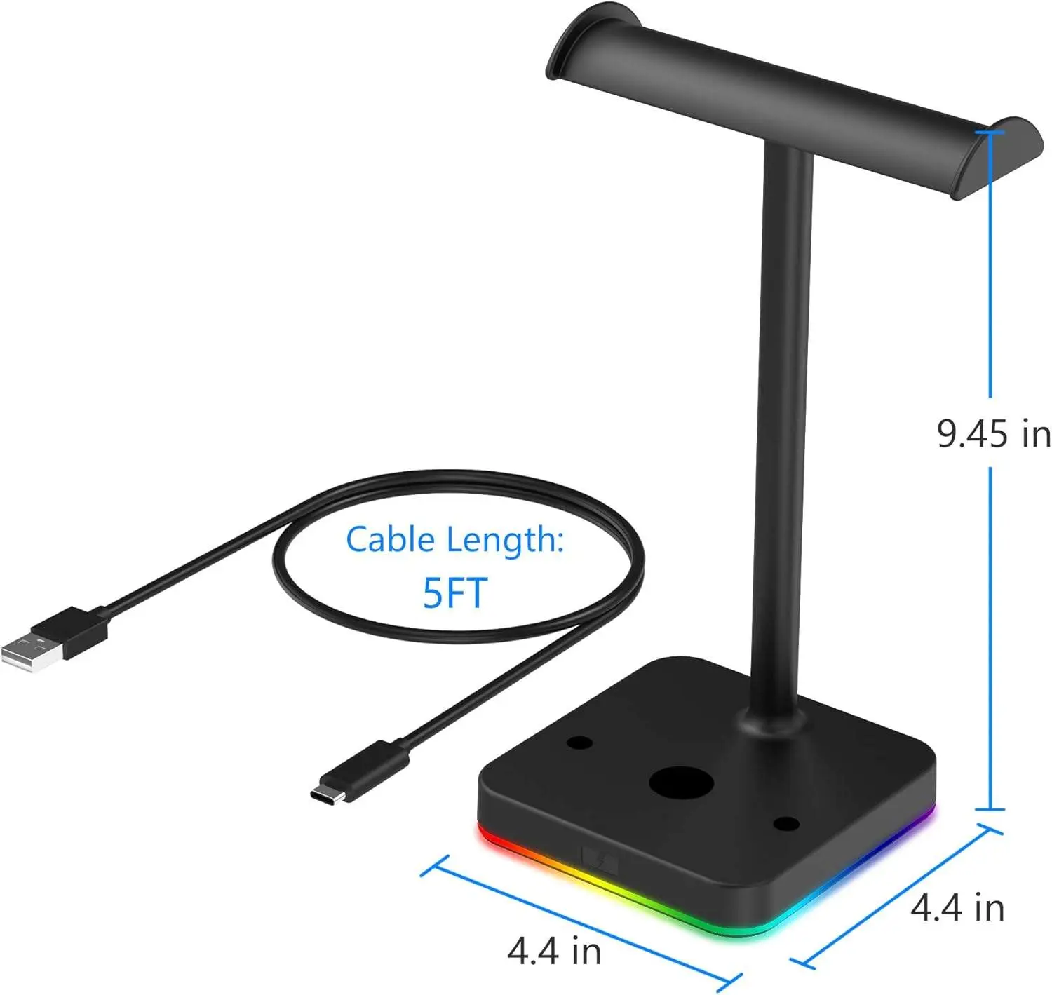 ·This gaming Headphone stand has RGB Color changing. It can display 9 fantastic lighting effects that can be selected merely by pressing a button. You can enjoy different light modes in different scenes.