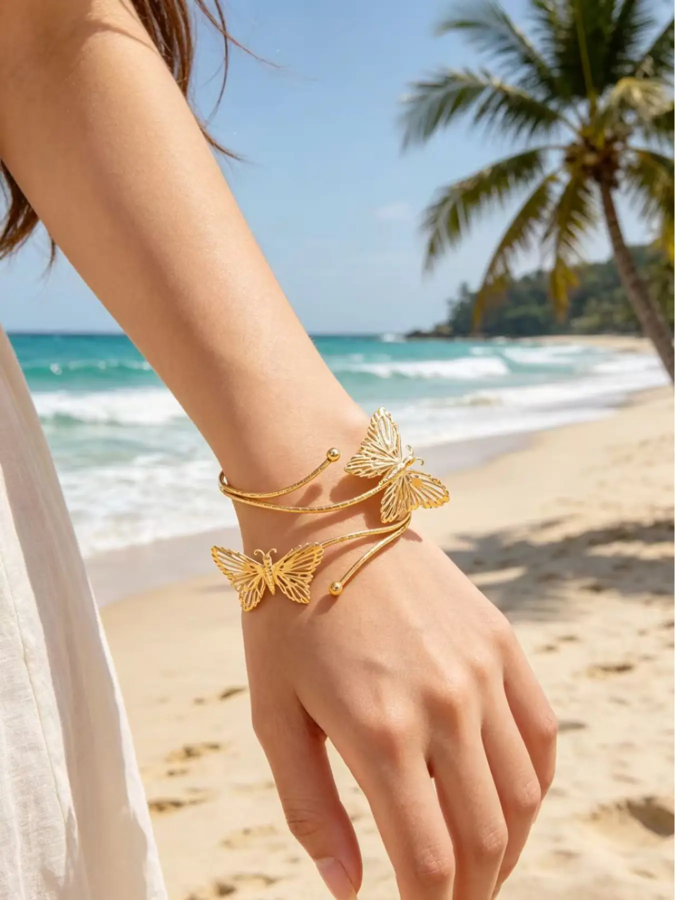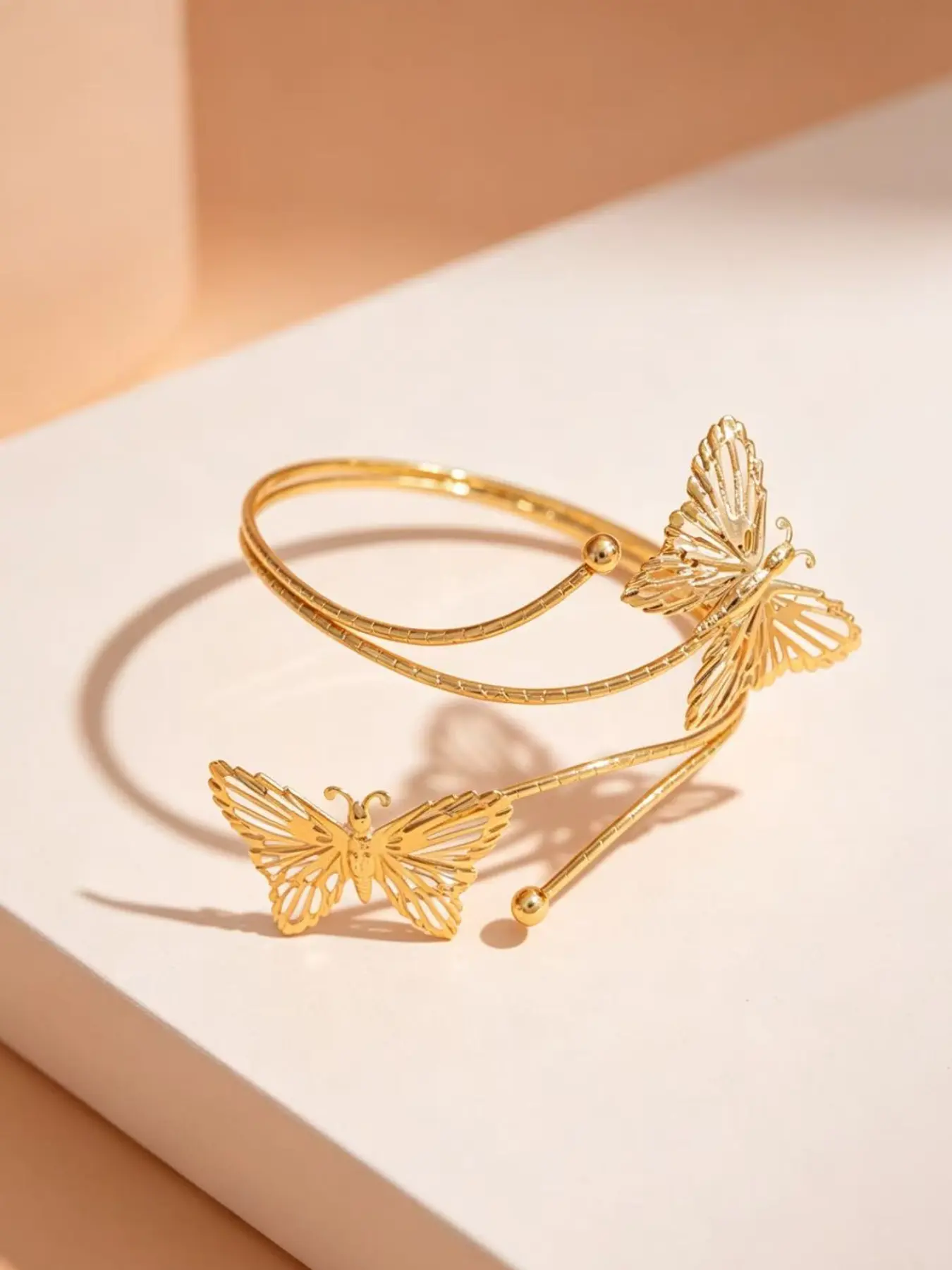 Gold Plated Butterfly Open Cuff Arm Bracelet, Adjustable Double Layer Armlet for Women, Elegant Hollow Out Butterfly Arm Jewelry for Summer Beach & Daily Wear