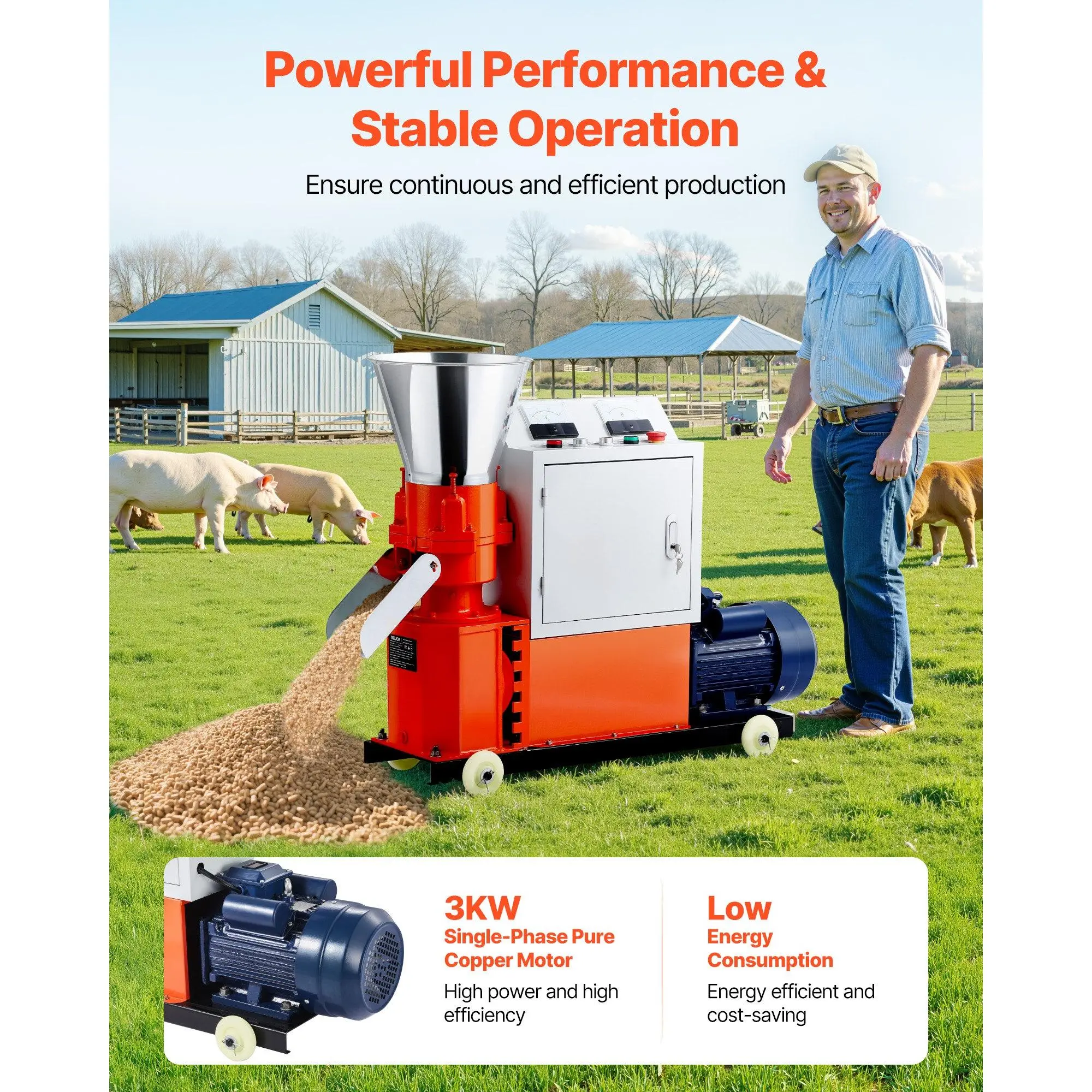 This feed pellet mill machine features a 3KW powerful pure copper motor, 6 mm steel grinding disc, 3 pressure rollers, and a durable steel structure, ideal for efficiently producing feed pellets for poultry and livestock, as well as processing industrial pellets such as hay, corn, straw, etc.