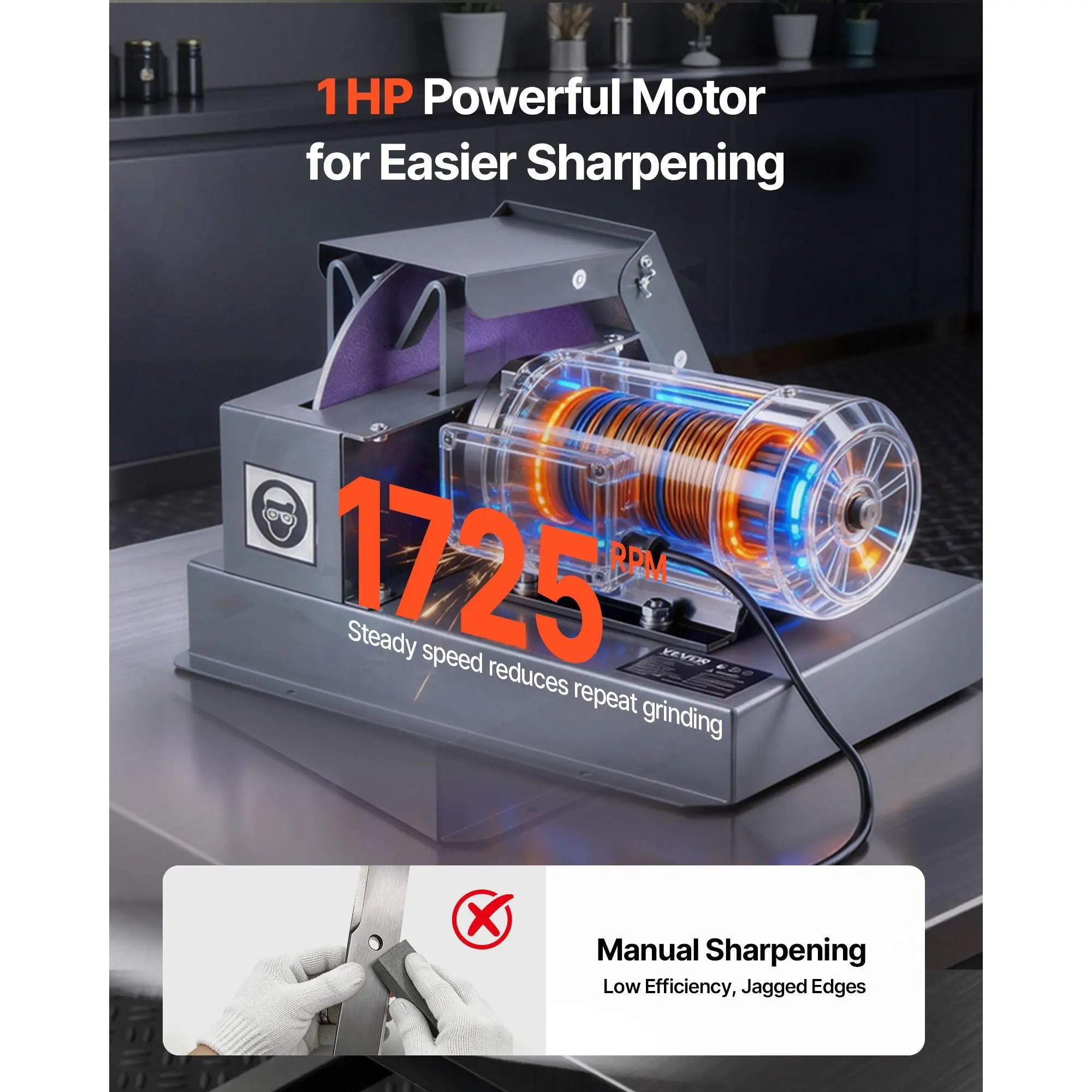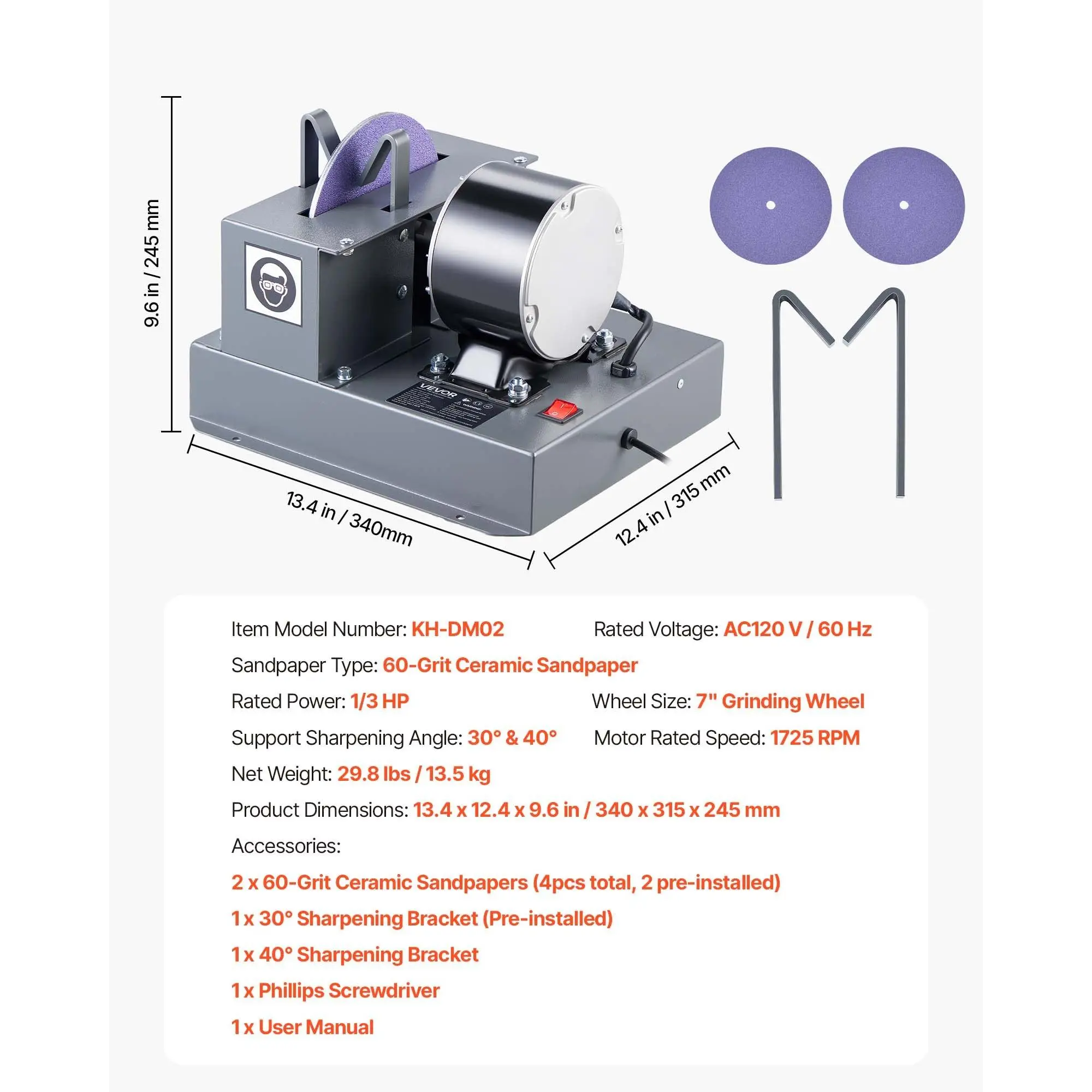 VEVOR Lawn Mower Blade Sharpener, 1HP Lawnmower Blades Grinder with 9 Ceramic Grinding Wheel, Grit Collector Balancer, 30/40 Blade Sharpening Machine for High Lift, Low Lift, Gator Flat BladesPowerful Motor Performance60-Grit Ceramic Sandpaper30/ 40 Sharpening JigMultiple AdvantagesWide ApplicationsDurable and StableWheel Size: 9 Grinding Wheel, Sandpaper Type: 60-Grit Ceramic Sandpaper, Support Sharpening Angle: 30 40, Item Model Number: KH-DM03, Motor Rated Speed: 1725 RPM, Rated Power: 1 HP, Product Dimensions: 16.9x 12.4x 10.4 in/ 430x 315x 265 mm, Net Weight: 42.1 lbs/ 19.1 kg, Rated Voltage: AC120 V/ 60 Hz