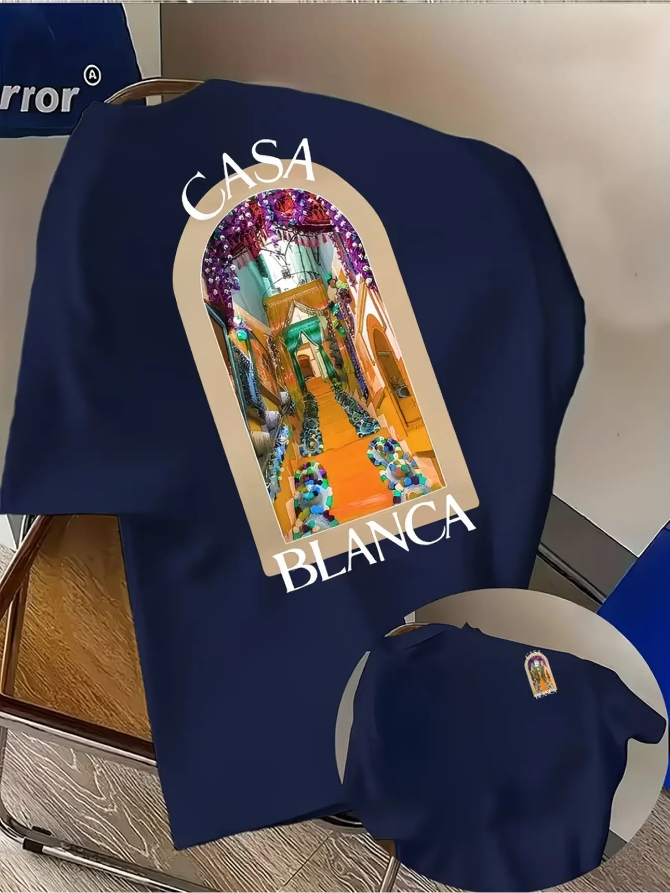 Men's Casual Comfortable Short Sleeve T-Shirt, Casablanca Graphic Print, Fitted Long Top, Ideal for Daily Wear, Travel, Dating