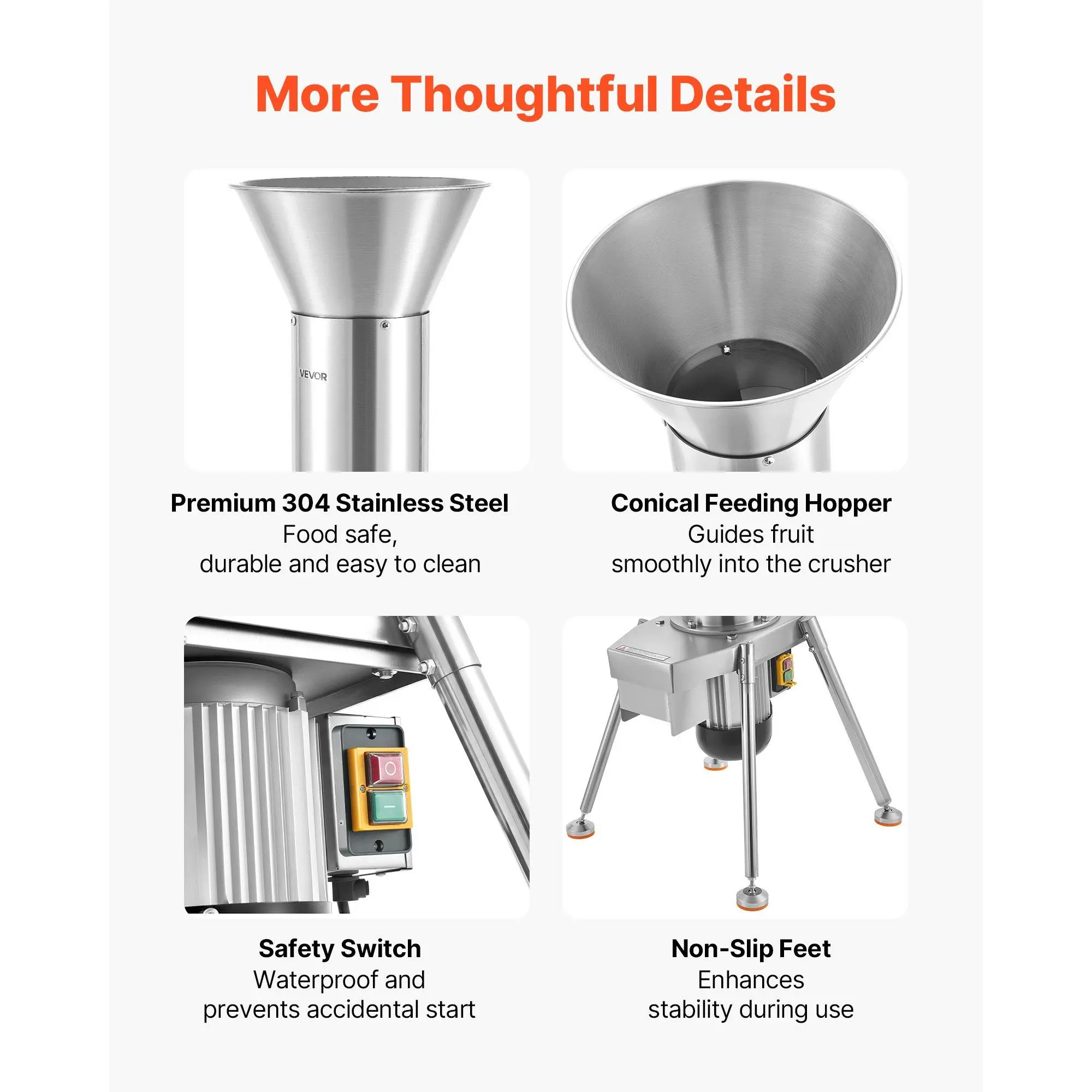Compared with manual crushing, this electric fruit crusher handles larger batches, crushes whole fruits, and produces more consistent mash, helping improve juice extraction while reducing labor and preparation time.