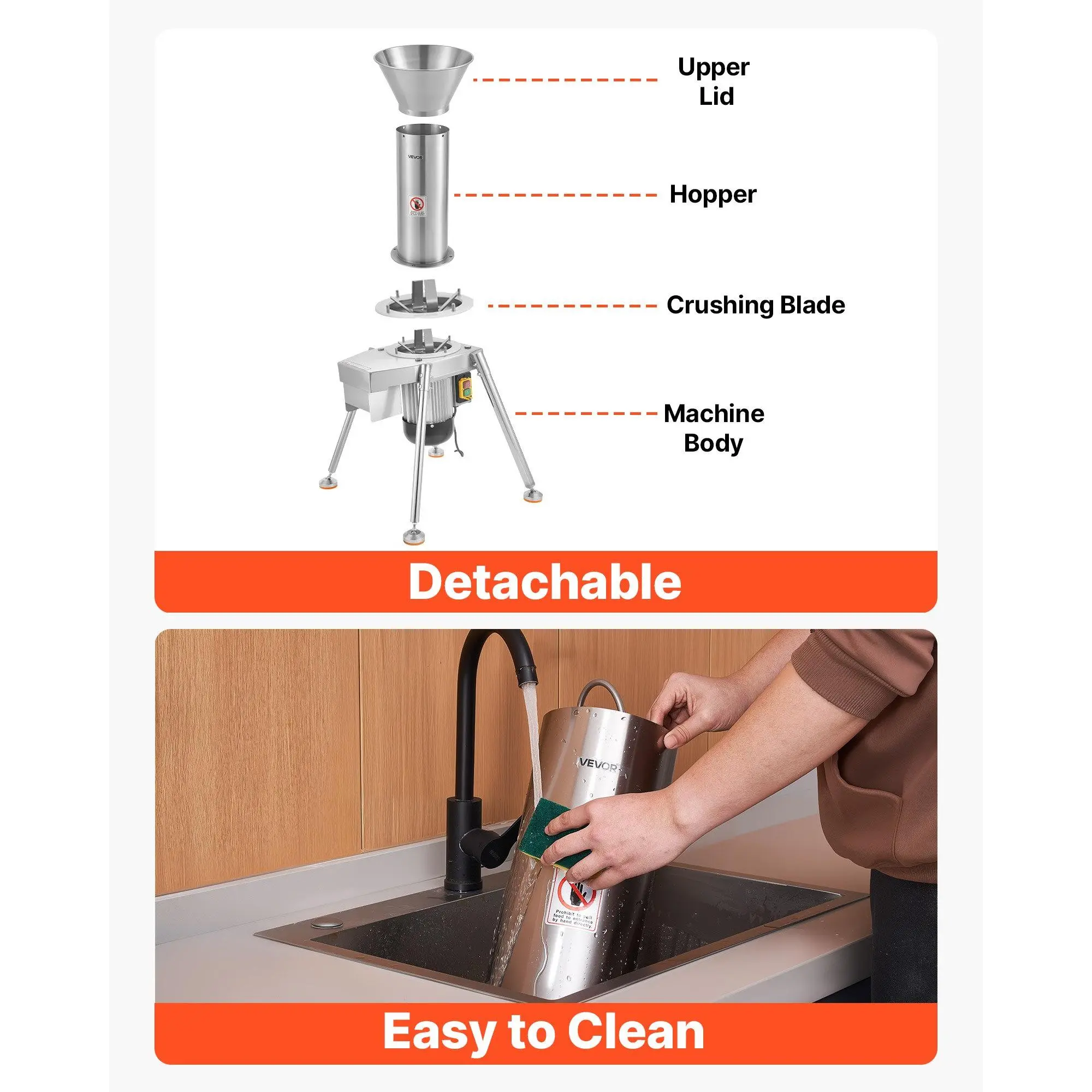 This electric fruit apple crusher efficiently crushes whole fruits into fine mash, improving pressing efficiency and juice yield. It is suitable for a variety of hard fruits and vegetables, ideal for homemade cider making, juicing, and home brewing.