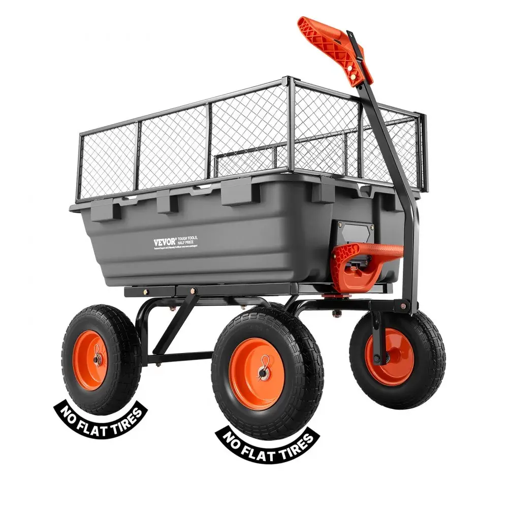 VEVOR Garden Dump Cart, 1200 lbs Poly Dump Cart, Garden Carts Dumps Wagon with Storage Fence, 2-in-1 Convertible Handle, 90 Quick-Dumps Mechanism, 180 Swivel Wheels, Yard Wagon for Plants, SoilNon-Slip HandleCorrosion-Resistant FrameEasy Controlled DumpingExpanded Load SpaceSmooth Turning ControlLightweight Tray DesignItem Model Number: TC4273C, Max Load Capacity: 1200lb/544kg, Product Dimensions: 43.31/77.95x 31.10x 25.98/35.43 inch (1100/1980x 790x 660/900mm), Net Weight: 68.34 lbs/31 kg, Main Material: Iron+ Plastic+ Polyurethane