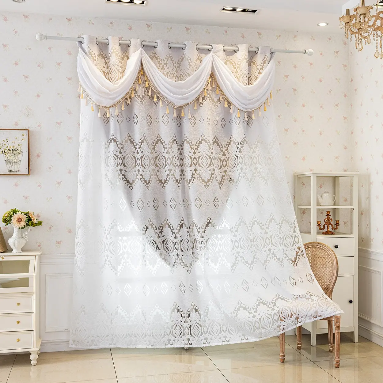 【Vintage Aesthetic】: Features a French vintage sheer curtain with a top drape design, adding a touch of elegance.