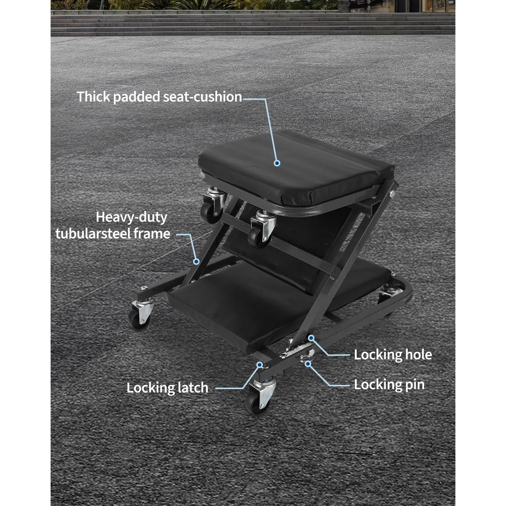 Low-Profile Mechanic Seat: Features an 8.5" height for easy access under vehicles, with a thick padded cushion and Z-frame design to reduce fatigue and optimize weight distribution for all-day comfort.