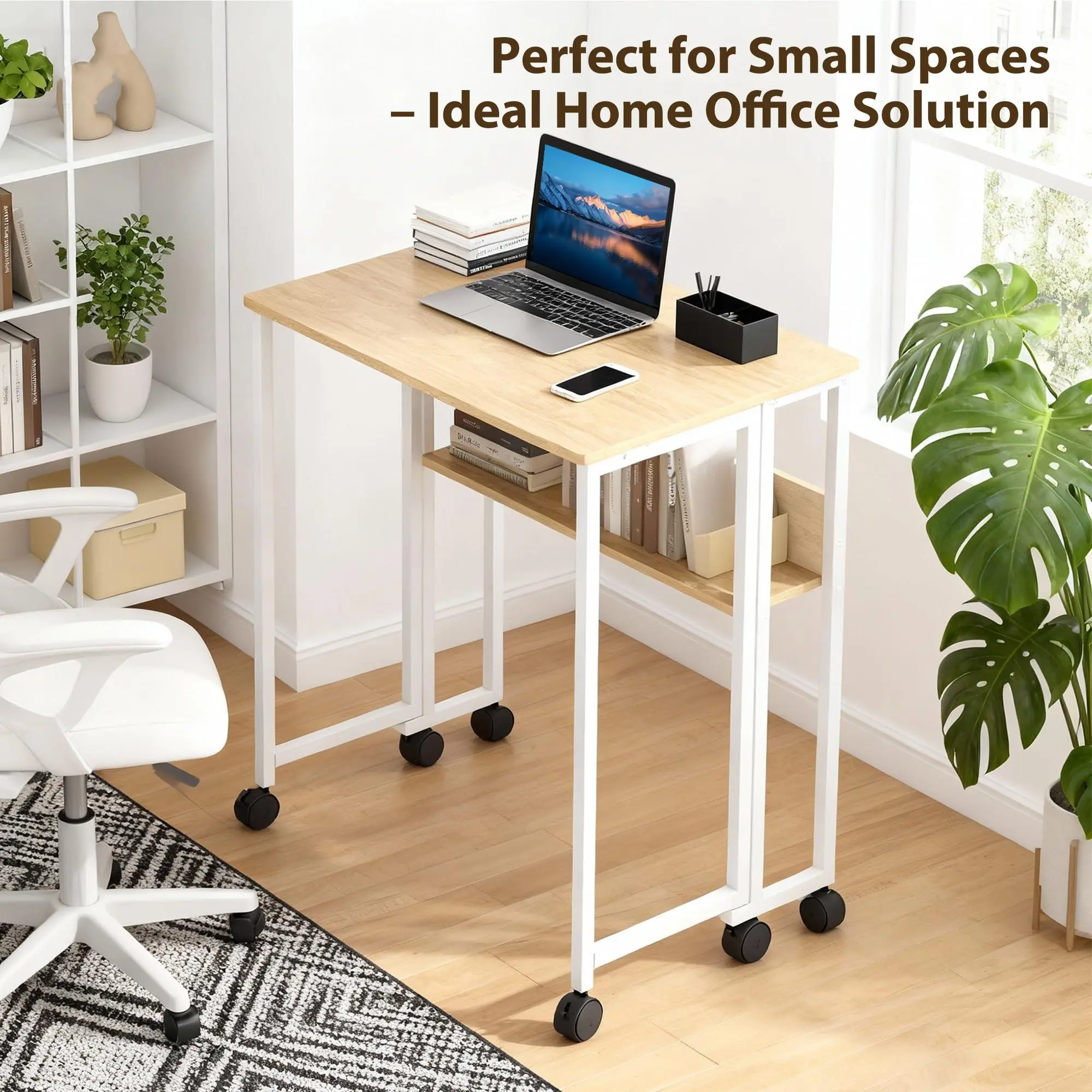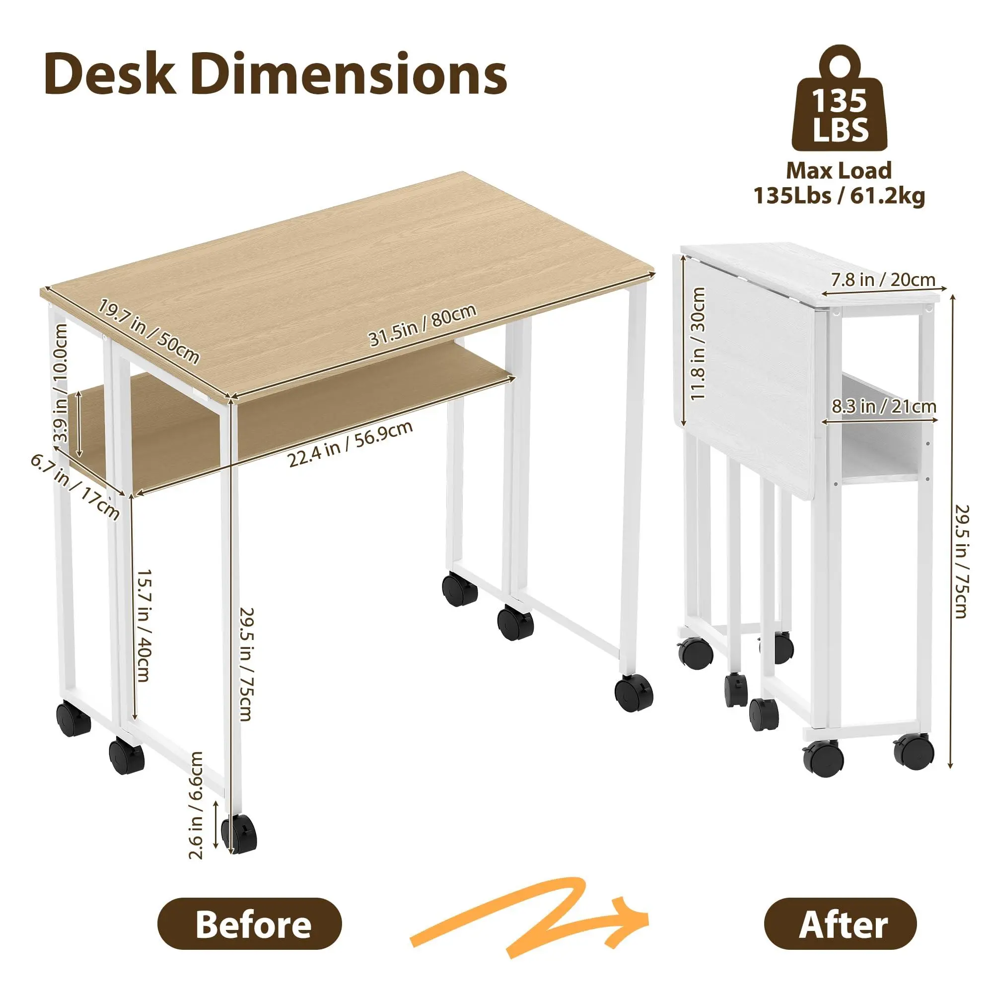 Space Saving & Instant Fold Design:This compact desk transforms your living space in seconds. It folds down to a mere 8.3-inch slim profile, allowing you to effortlessly store it behind doors, under beds, or in narrow closets. Unfold it instantly for a full-size 29.5-inch height desktop – the perfect space-saving solution for tiny apartments, dorm rooms, and multipurpose homes.