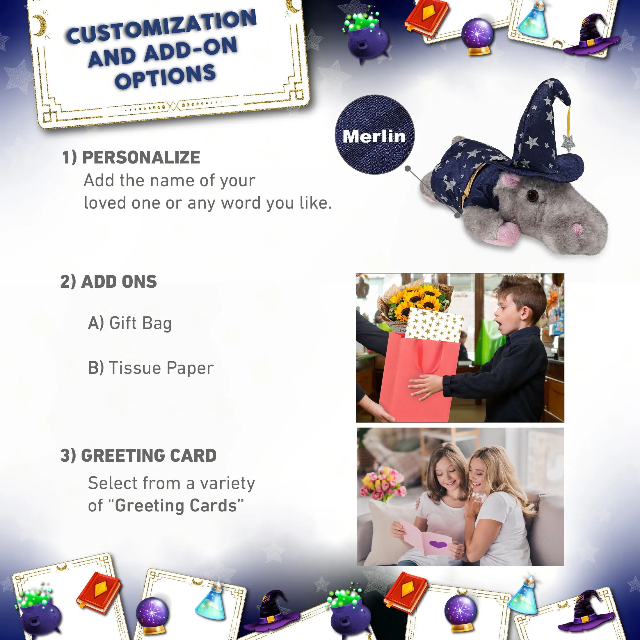 ·Personalization, Customization, and Add-On Options - The hippo stuffed animal comes dressed in a full wizard outfit, with a wizard cloak and hat with star details. Make your wizard stuffed hippo special by adding a personalized name, which we will imprint onto the plush. You can customize your plush wizard toy by adding any of our add-ons to create the perfect gift: 1) Gift Bag 2) Tissue Paper 3) Greeting Card.