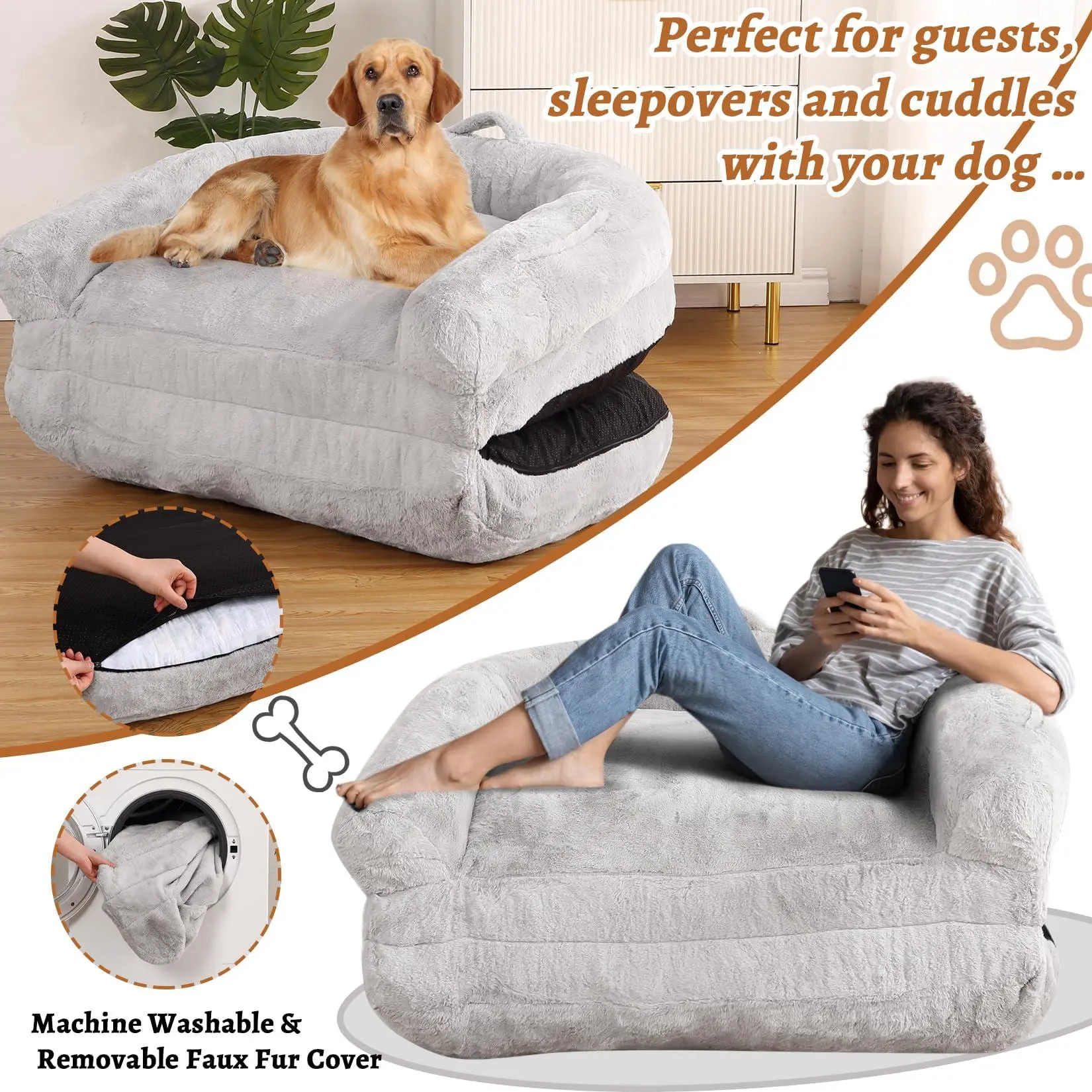 【NON SLIP & MULTI FUNCTIONAL】 The bottom of dog bed has a non-slip design, preventing it from sliding during use. The human size dog bed is perfect for guests, sleepovers and cuddles with your pets.