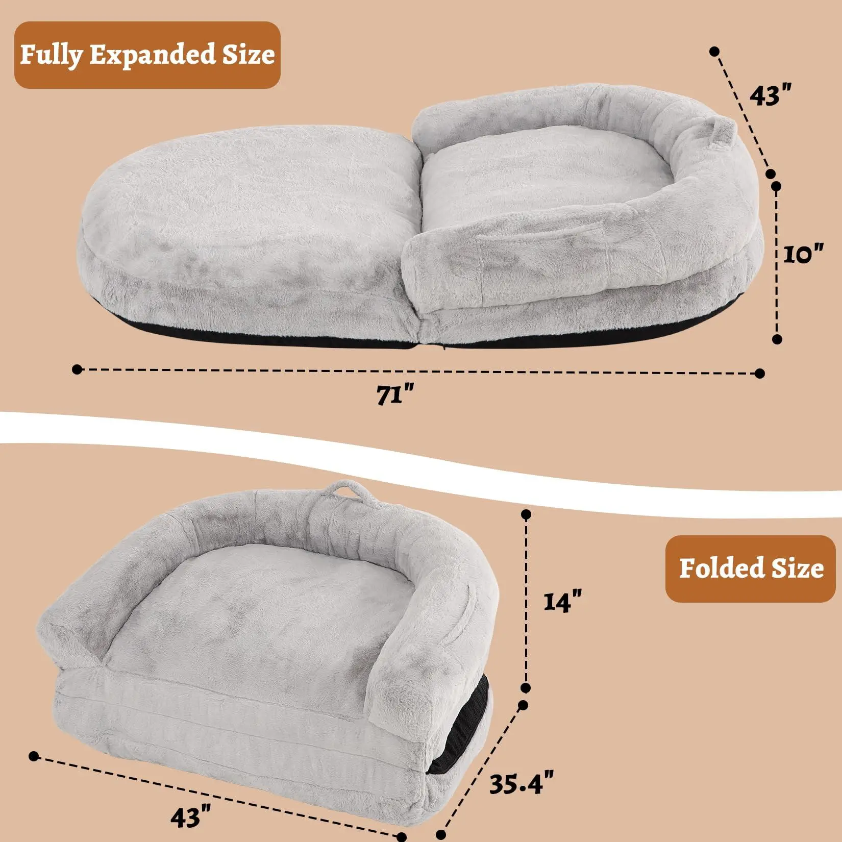【EASY CLEAN】The human-sized dog bed cover is fully removable and machine washable. It can be hang dried or machine dried on a low tumble setting. TIPS: Upon unwrapping the package, allow this foldable dog bed to naturally unfold. Prior to use, gently pat and shake the dog bed to ensure optimal fluffiness.